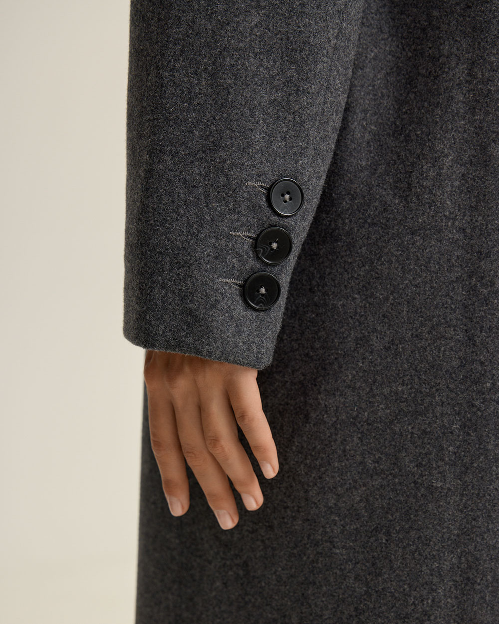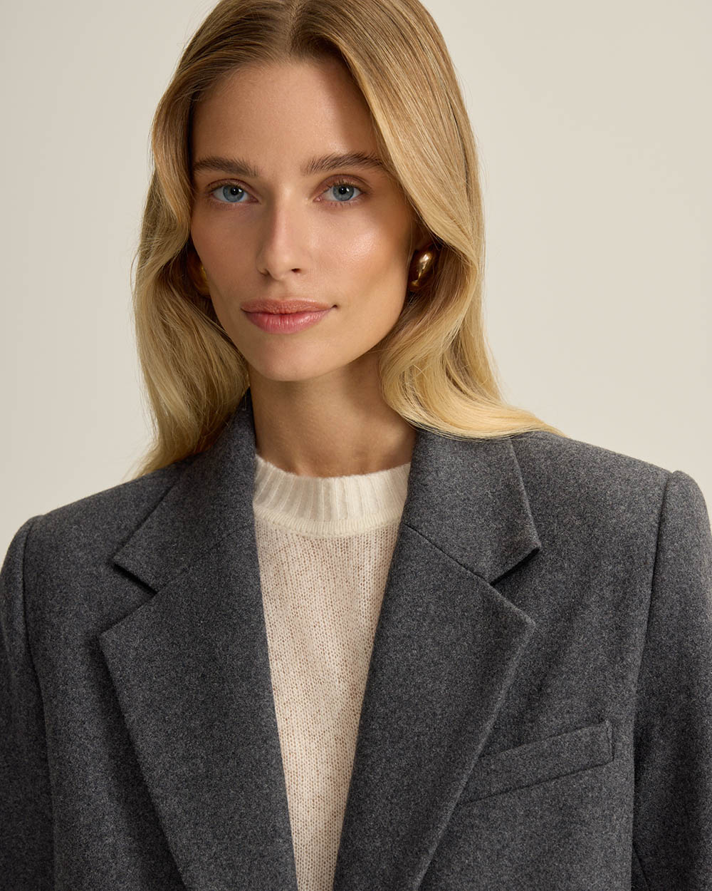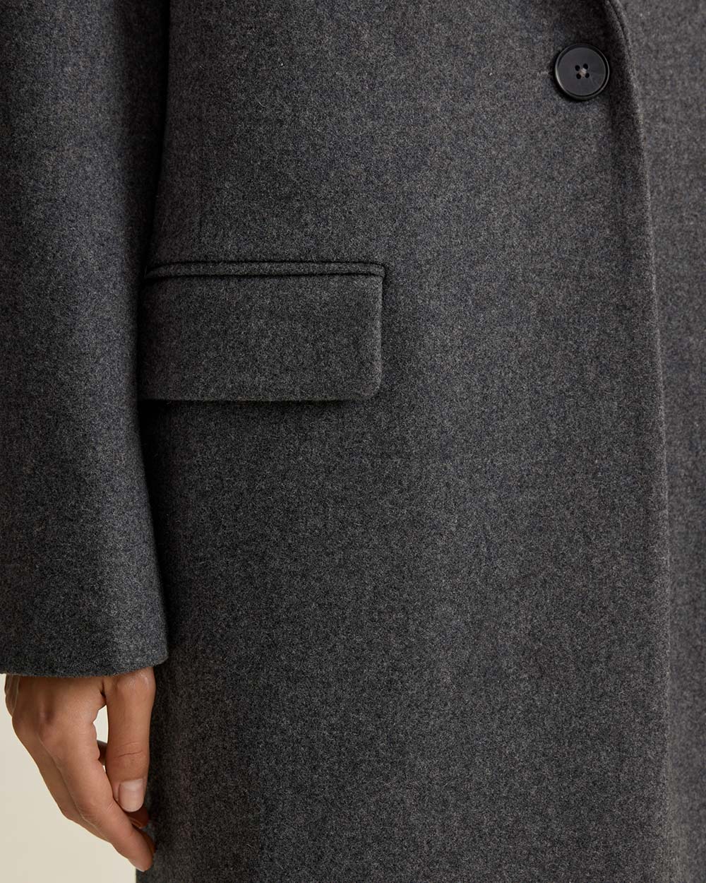 Однобортное пальто прямого кроя из шерсти. Лаконичный силуэт с четкой линией плеча и посадкой оверсайз — современная интерпретация классики. Подплечники, лацканы и карманы с клапанами придают образу архитектурность и благородную строгость.