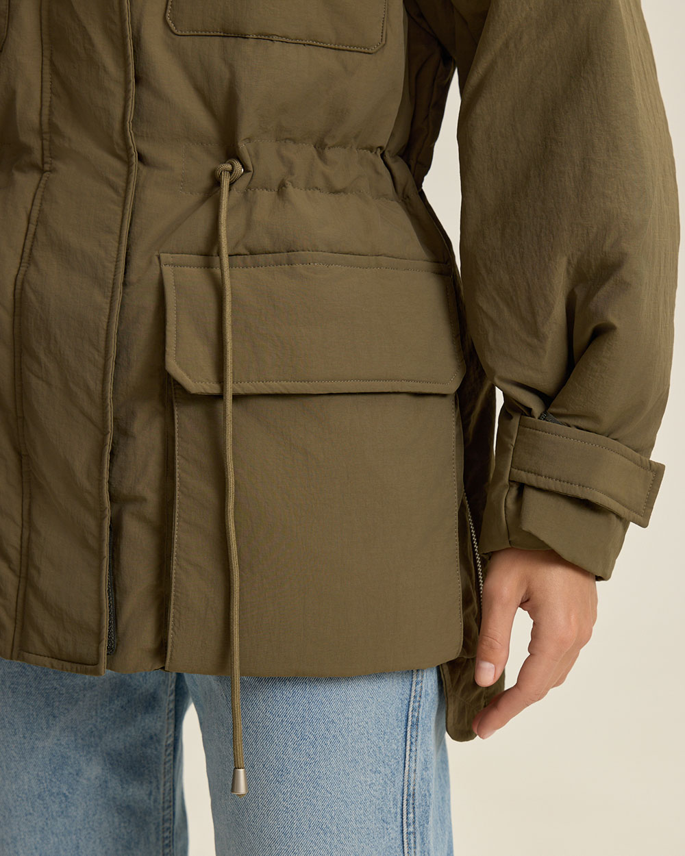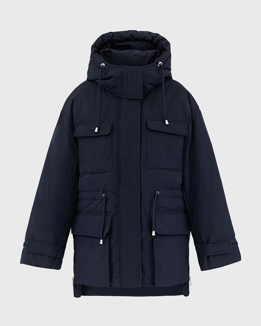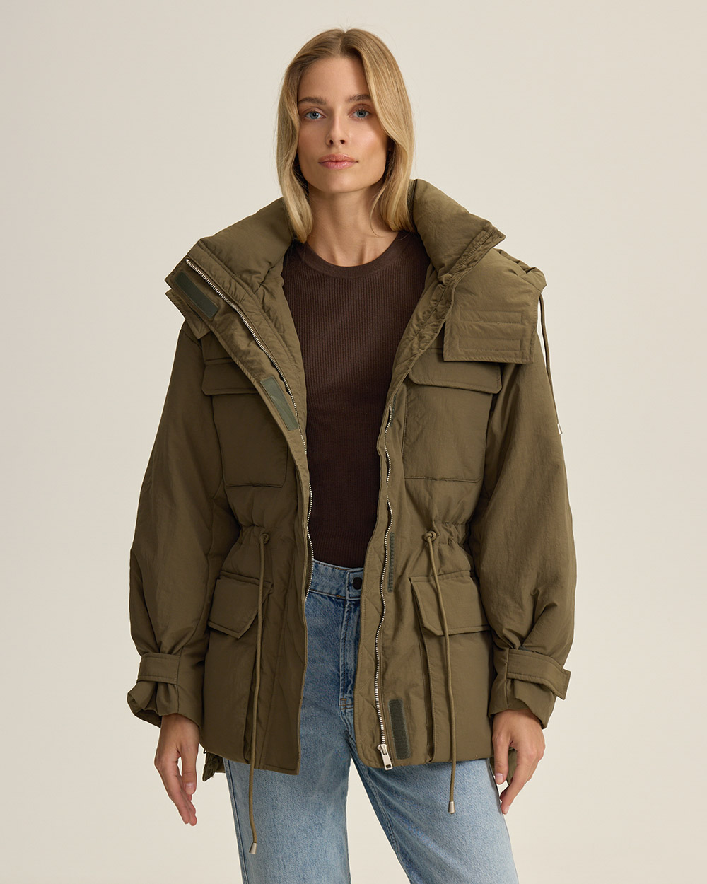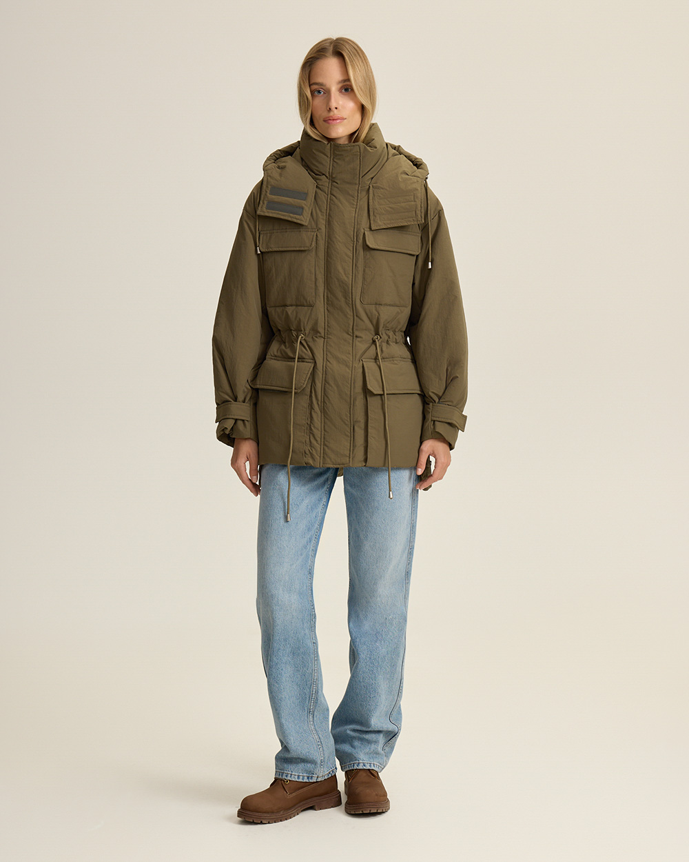 Пуховик надежно застегивается на молнию и липучки. Эластичный пояс с кулиской дает возможность корректировать силуэт.