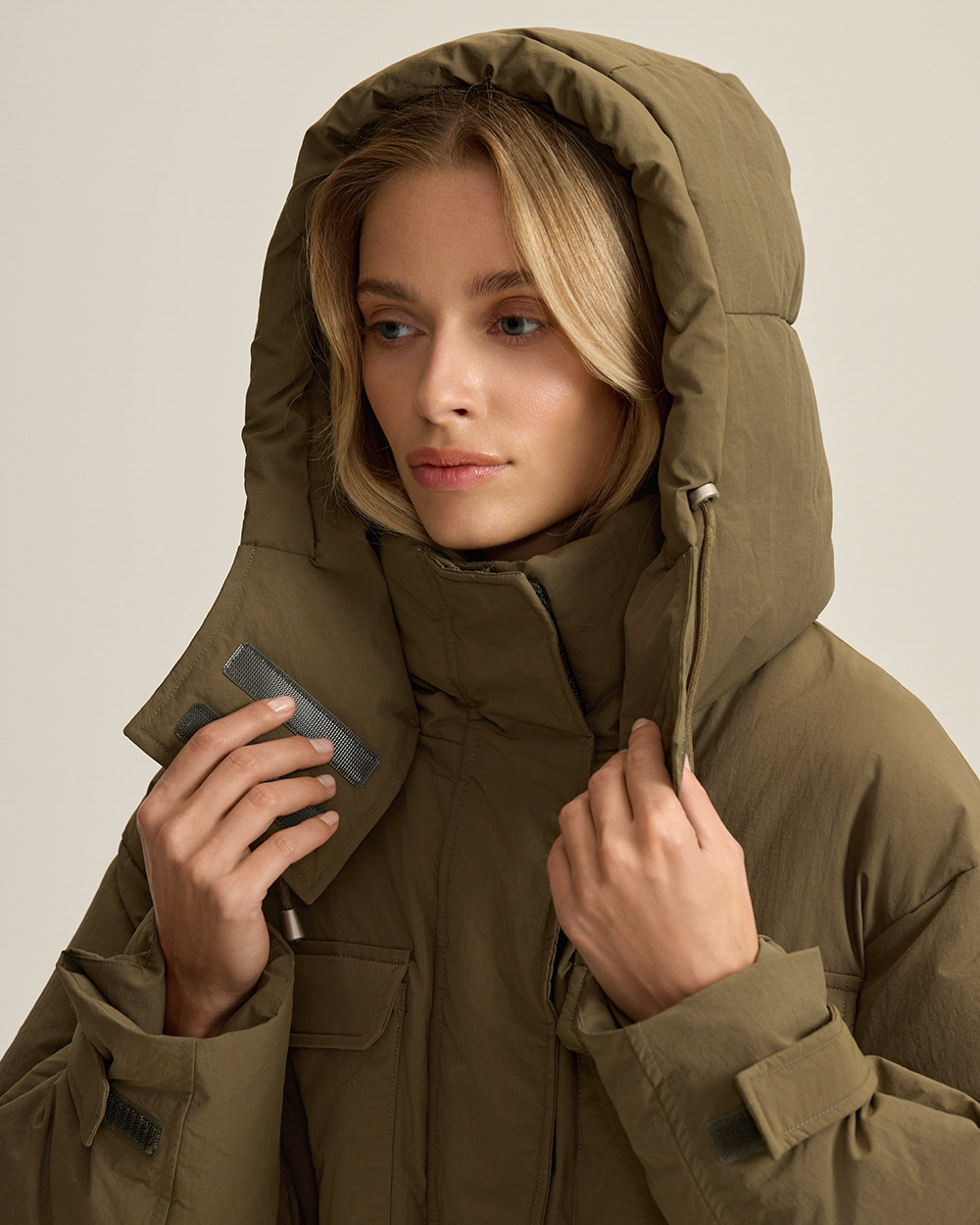 Пуховик плотно набит для использования в низких температурах. Теплый натуральный наполнитель: 80% пух, 20% перо. Капюшон на кулиске и липучках.