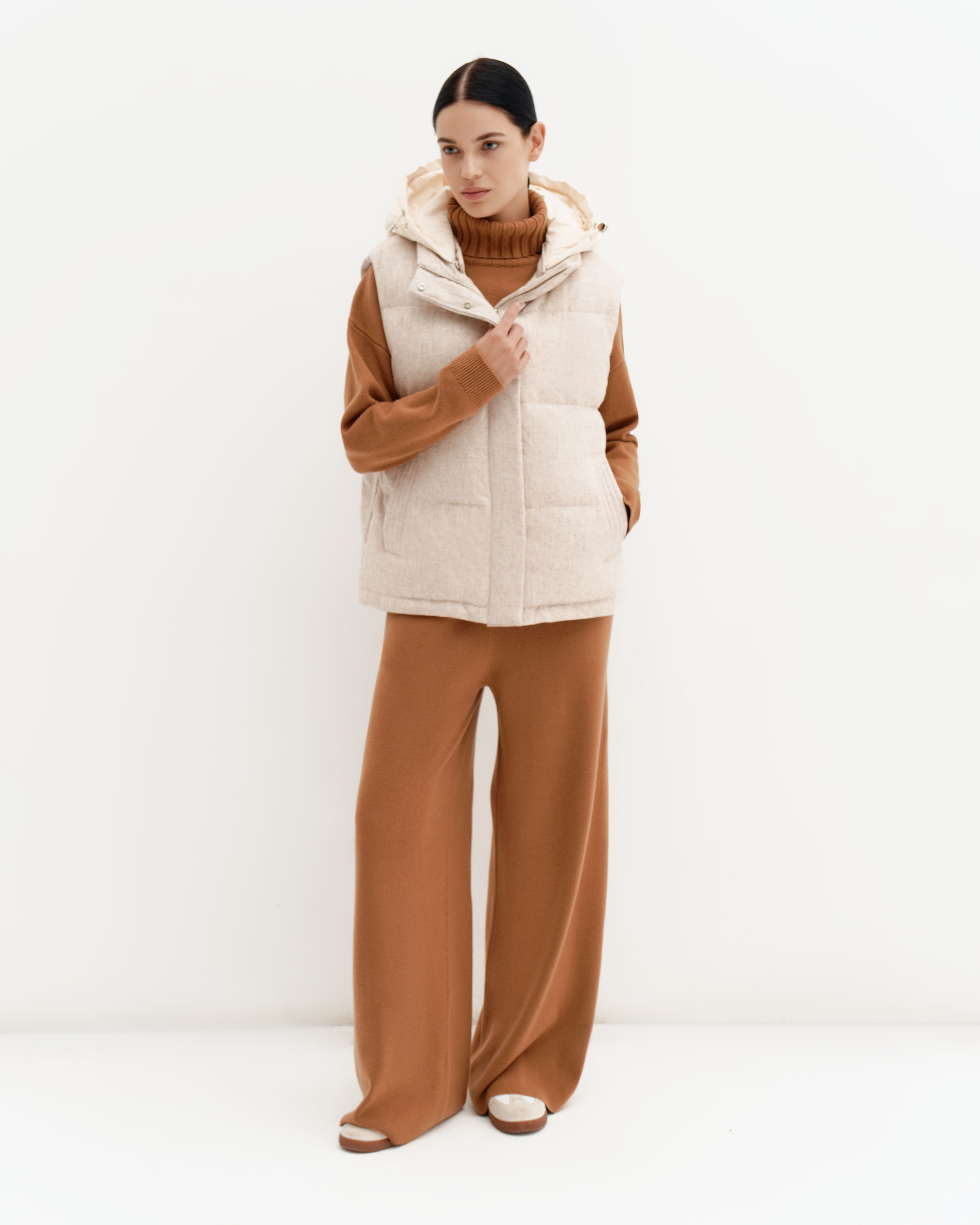 Непромокаемый прямой, объемный жилет с капюшоном. Застежка на молнию и кнопки. Главная особенность — в шерстяной ткани верха, напоминающей фактурную благородную ткань пальто, но непромокаемой благодаря современным технологиям.