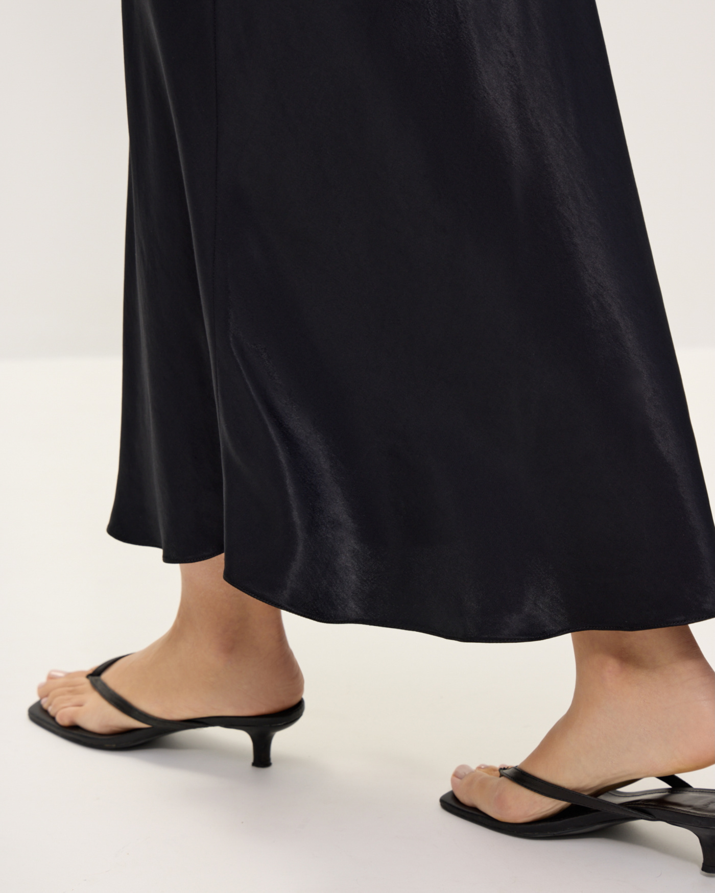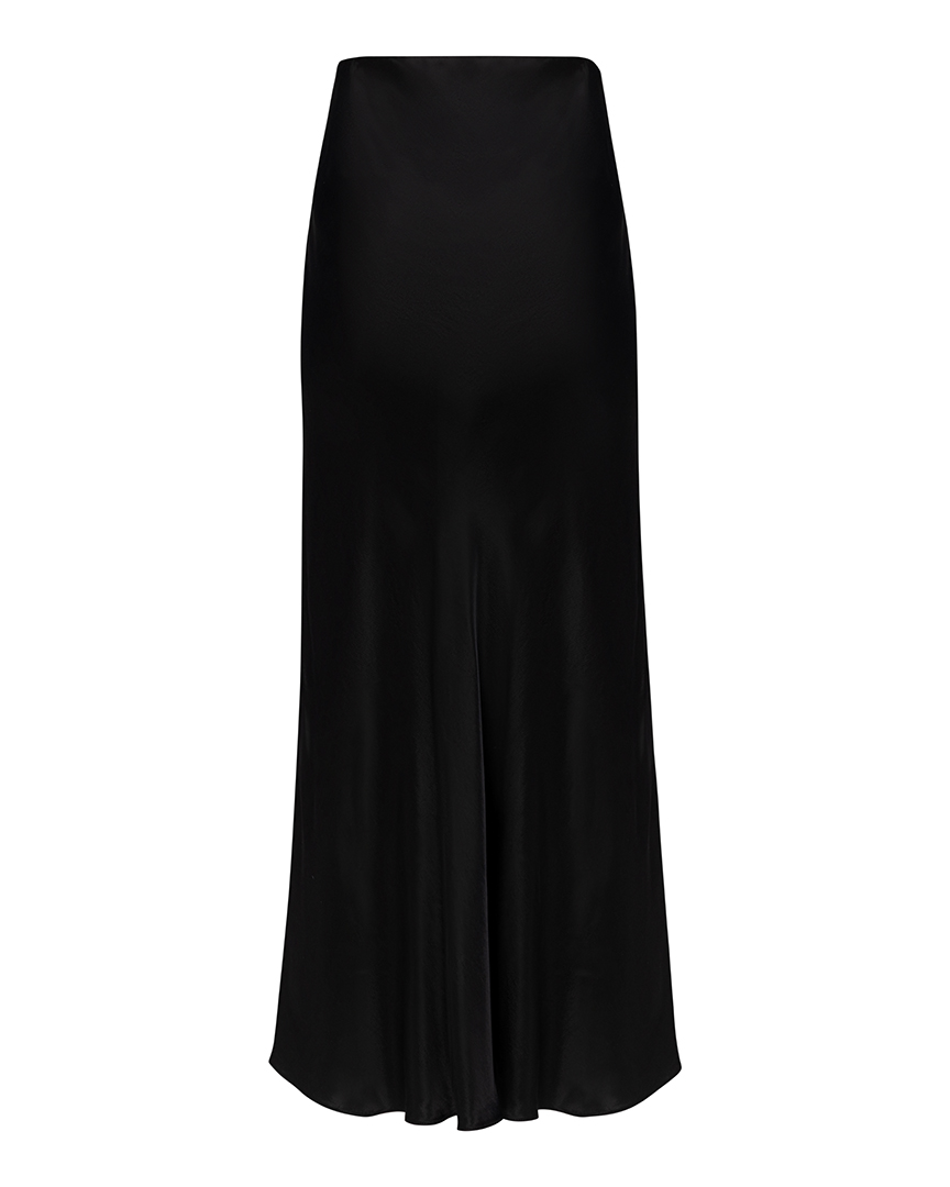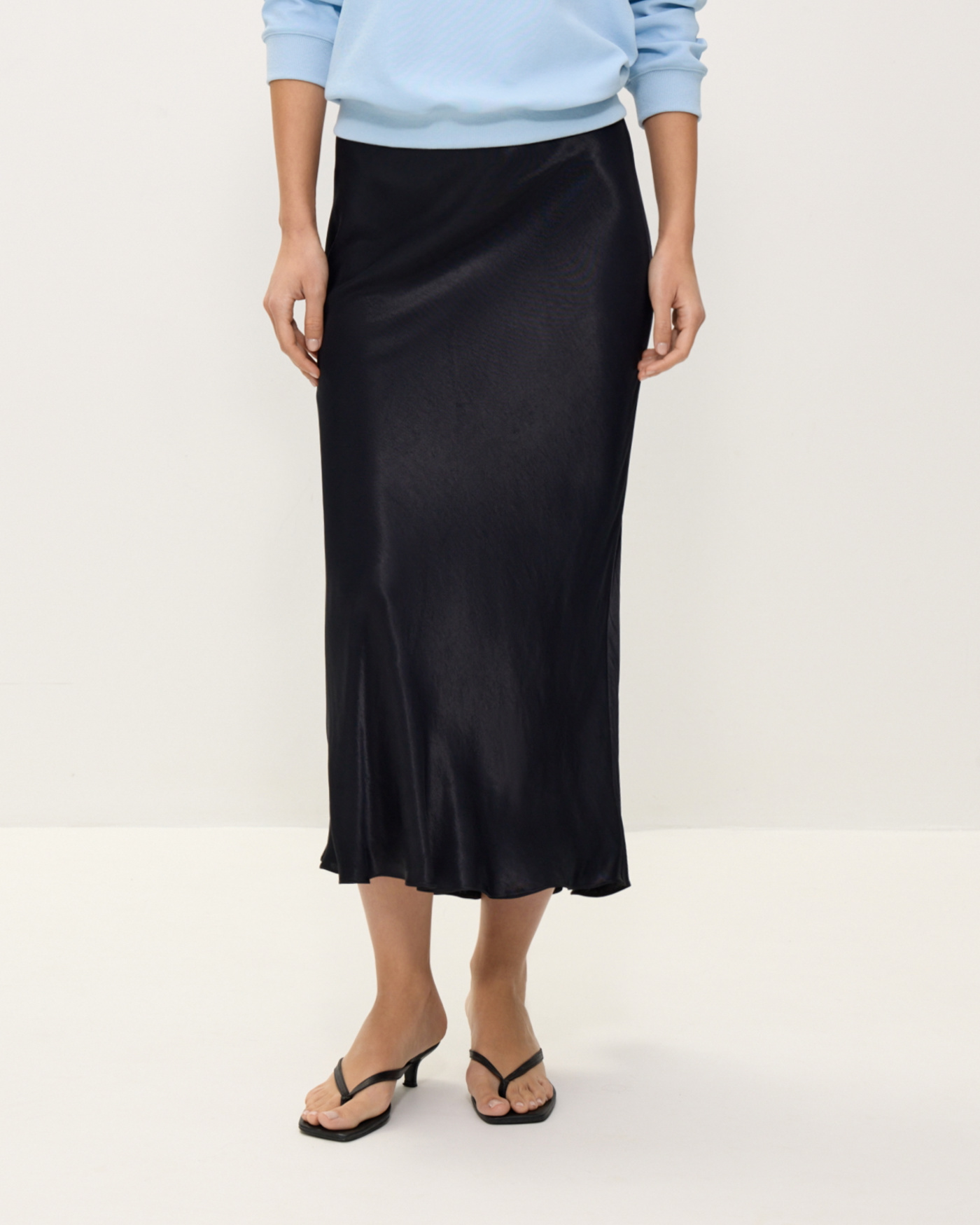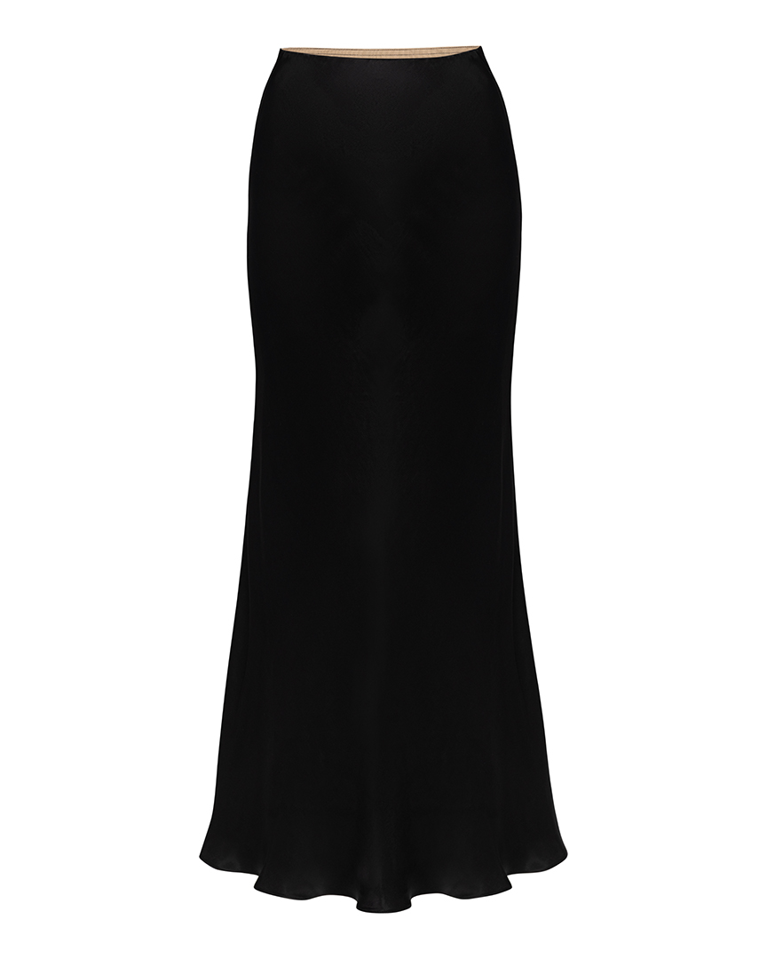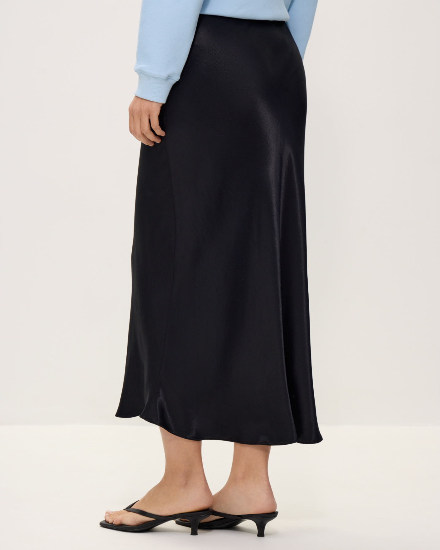 Юбка длины мидакси (между миди и макси) из струящейся атласной вискозы. Пояс на резинке. Крой по косой вытягивает силуэт и подчеркивает фигуру.