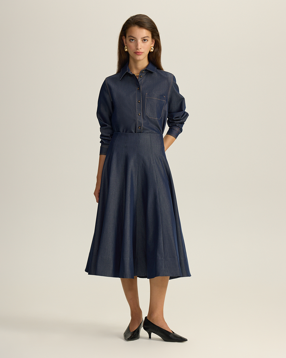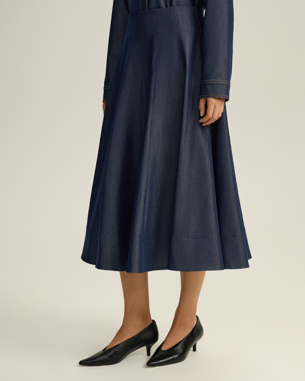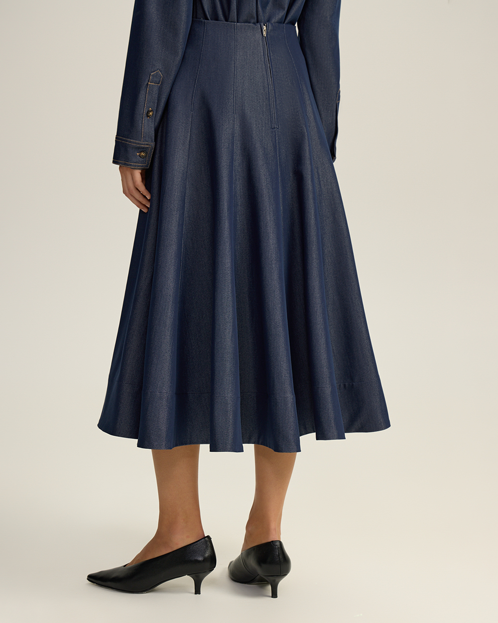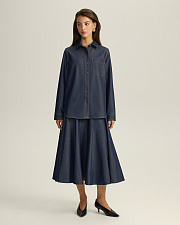 Расклешенная юбка миди из денима с эффектом "сырой" варки. Застежка на молнию. Швы контрастной нитью. Соберите комплект с джинсовой рубашкой из нашей коллекции.