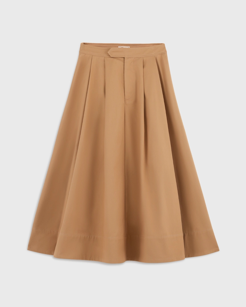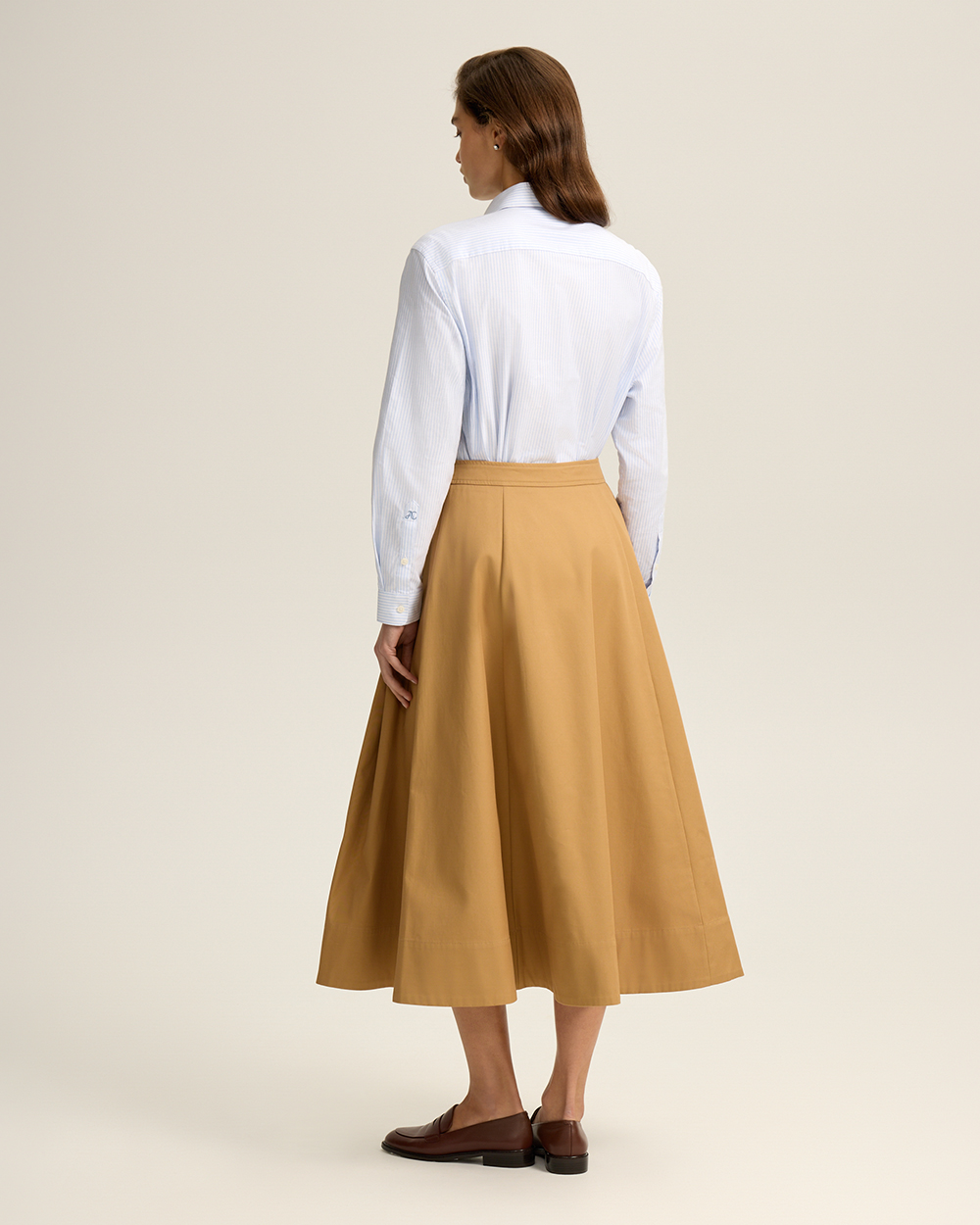 Однотонная юбка из комфортного хлопка с добавлением спандекса. Актуальная длина мидакси (ниже середины икры), посадка на талии и крой “солнце” создают женственный силуэт.