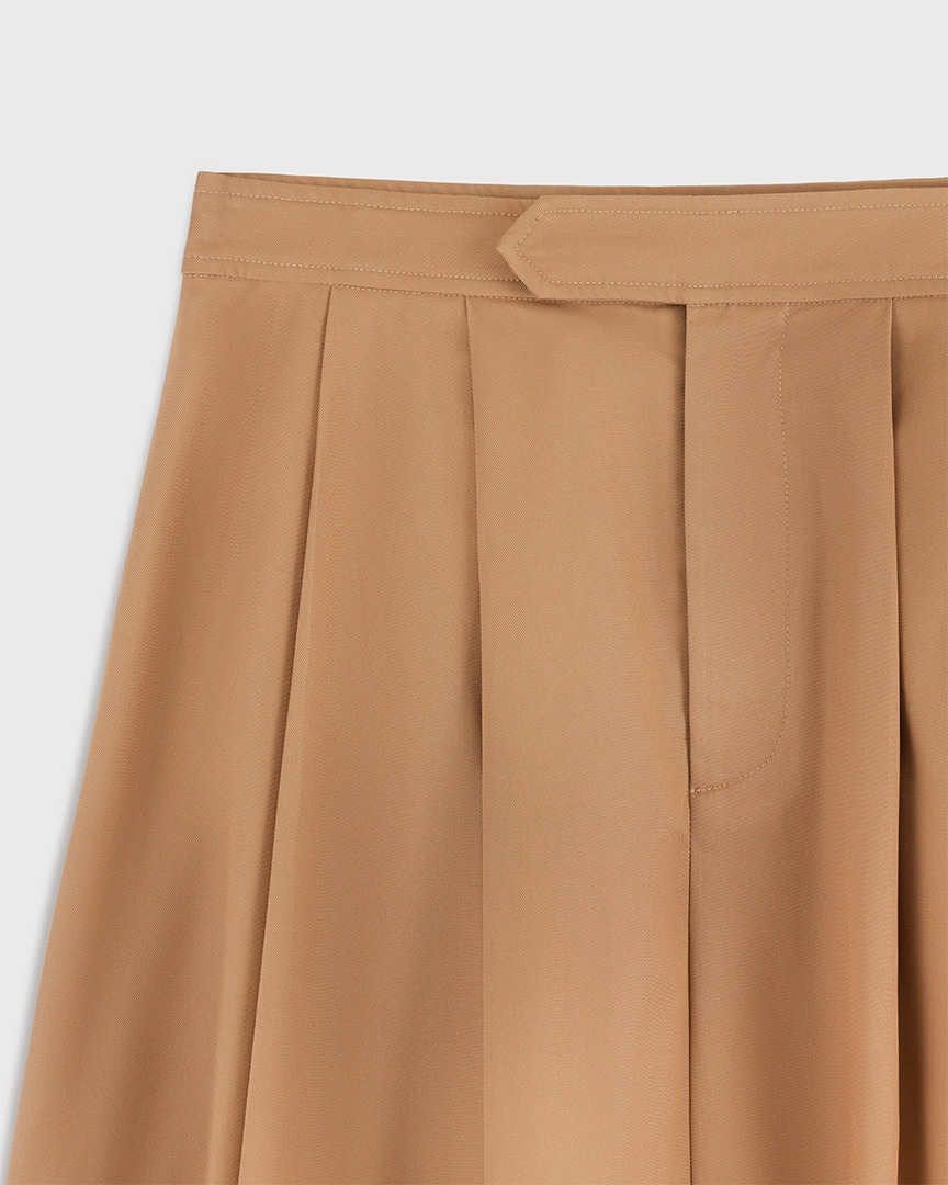 Передние прорезные карманы в складках. Акцентная застежка спереди, внутри застегивается на молнию спереди и крючок.