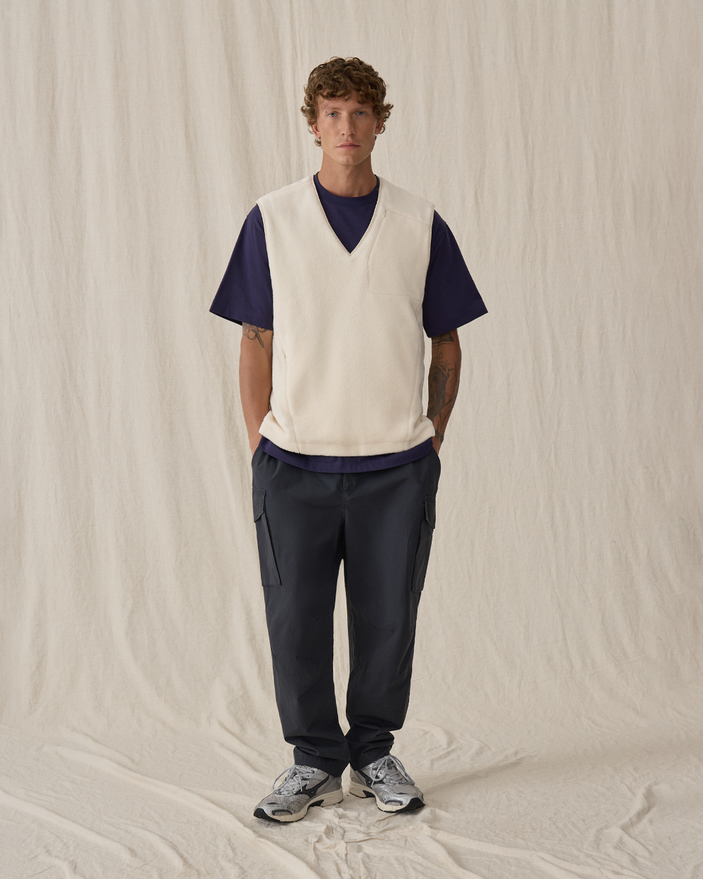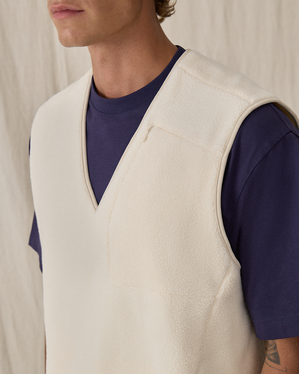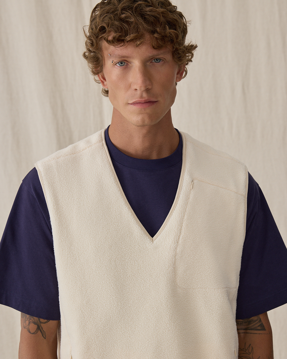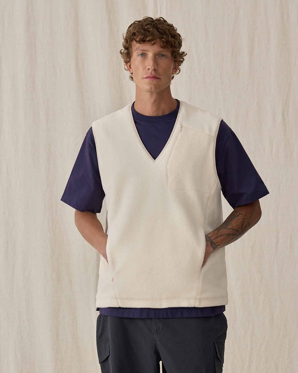 Жилет прямого кроя из мягкого флиса шерпа, из смесового хлопка. Материал приятен на ощупь, хорошо сохраняет тепло, в нем будет комфортно весь день. Модель дополнена тремя функциональными карманами на молнии — двумя спереди и одним нагрудным, чтобы все необходимые мелочи всегда были под рукой. Лаконичный силуэт делает жилет универсальным элементом мужского гардероба.