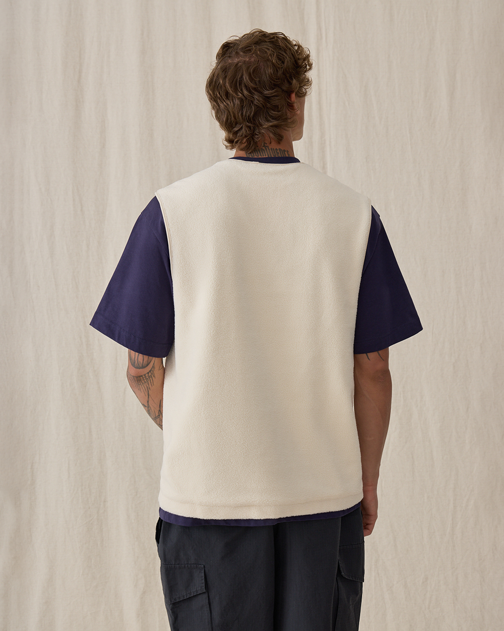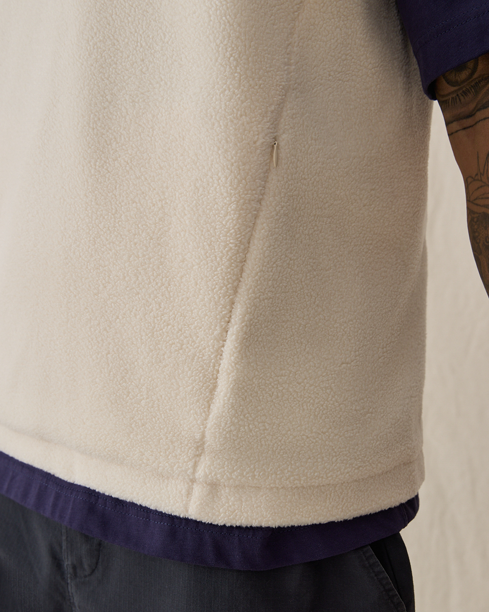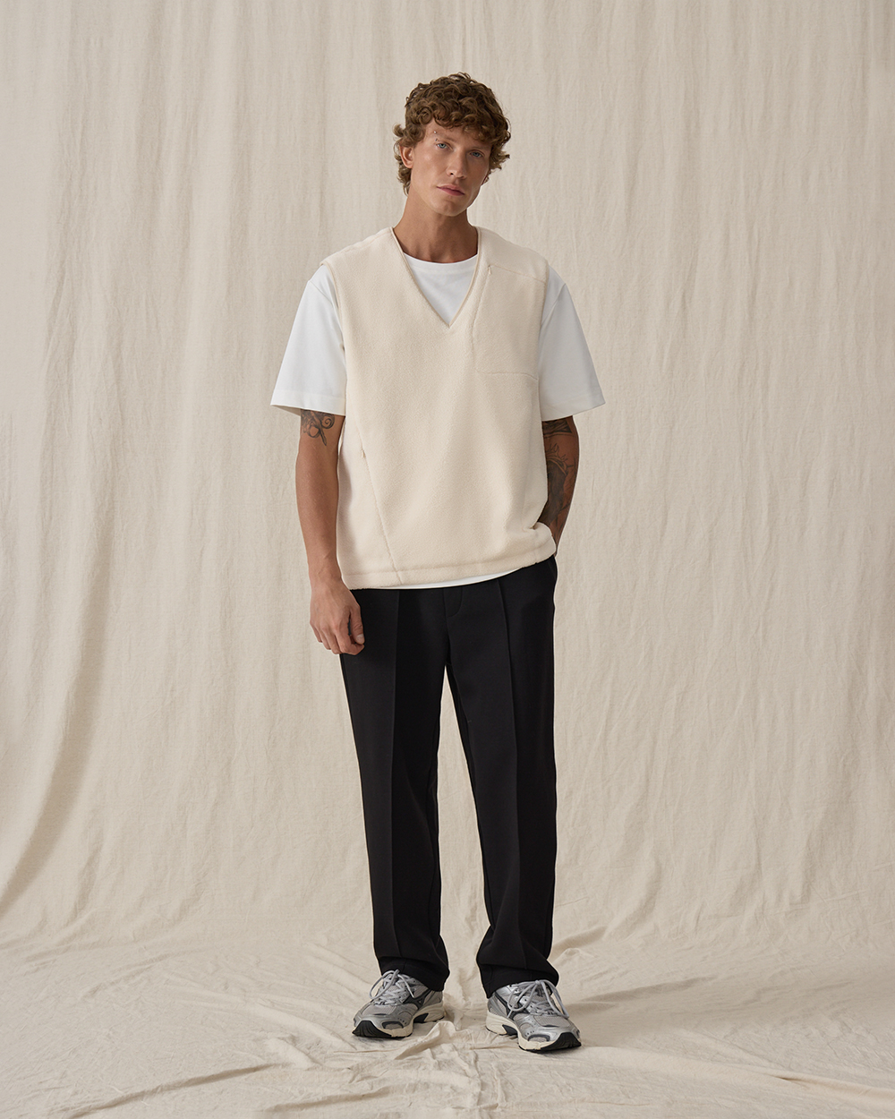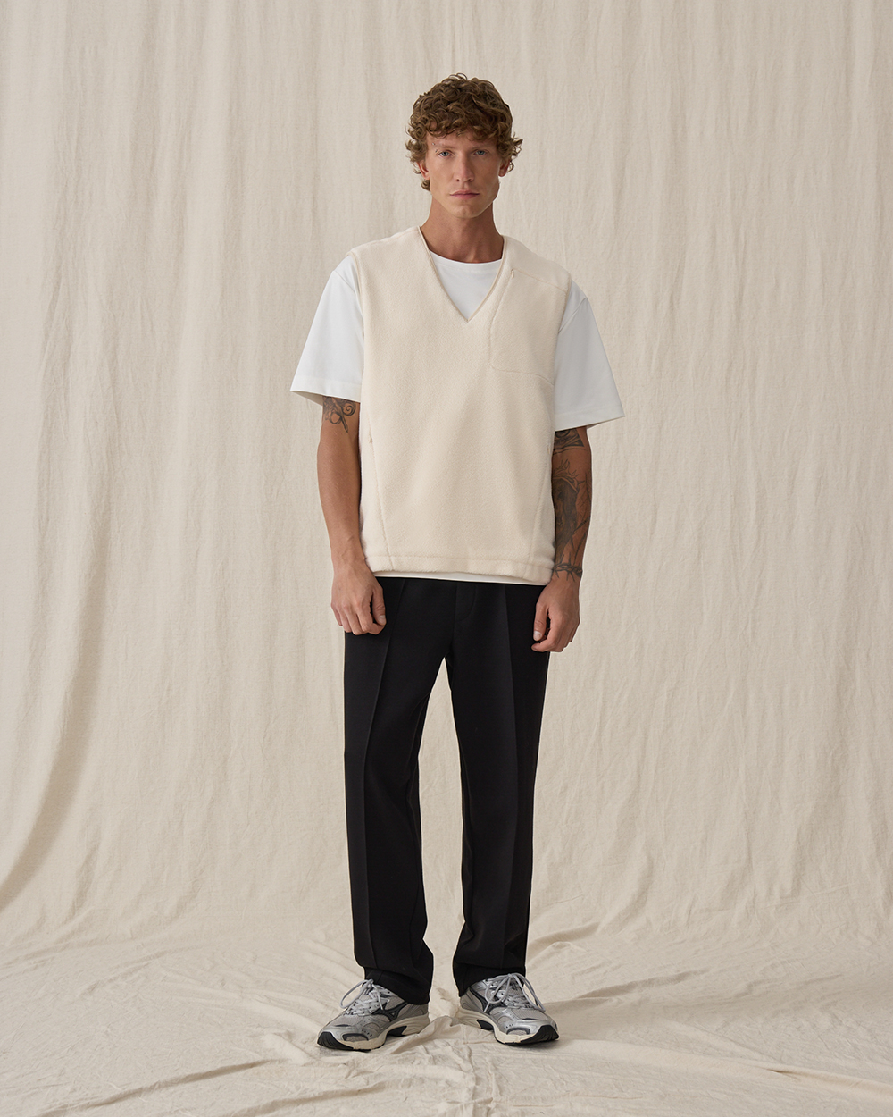 Жилет прямого кроя из мягкого флиса шерпа, из смесового хлопка. Материал приятен на ощупь, хорошо сохраняет тепло, в нем будет комфортно весь день. Модель дополнена тремя функциональными карманами на молнии — двумя спереди и одним нагрудным, чтобы все необходимые мелочи всегда были под рукой. Лаконичный силуэт делает жилет универсальным элементом мужского гардероба.