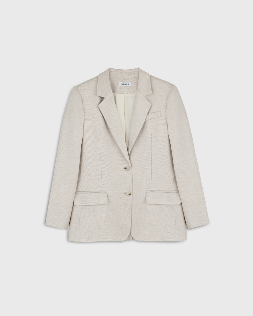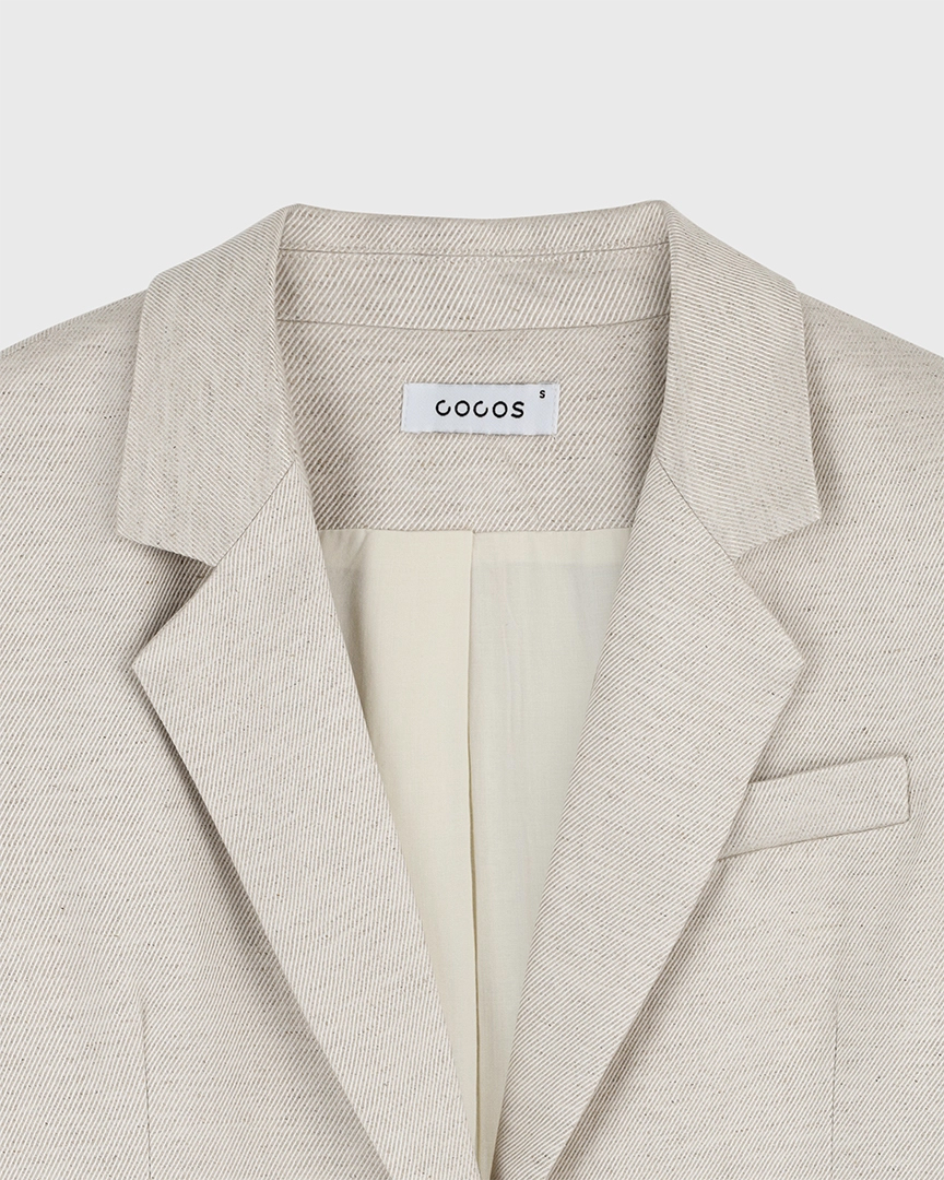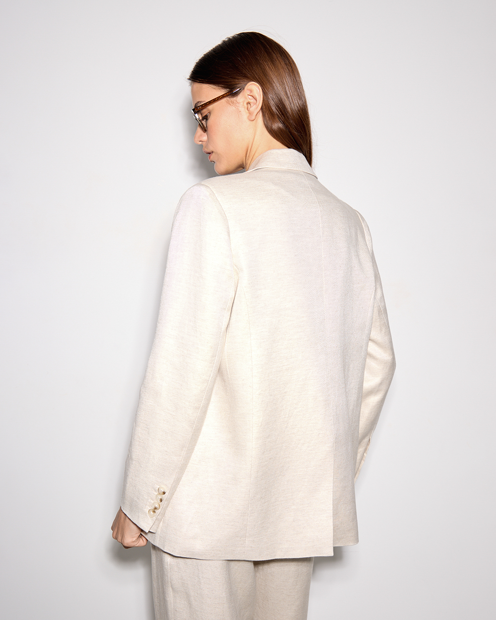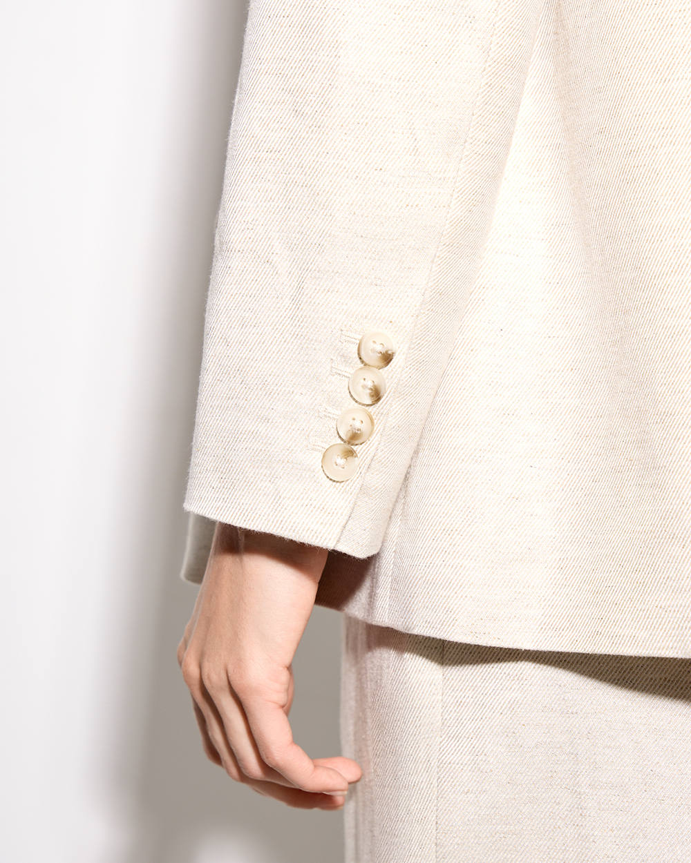 Однобортный жакет прямого кроя из вискозы и льна, на комфортной подкладке из тенселя и района. Подплечники. Передние карманы с клапанами, нагрудный карман. Светлые роговые пуговицы в натуральной эстетике на застежке и манжетах.