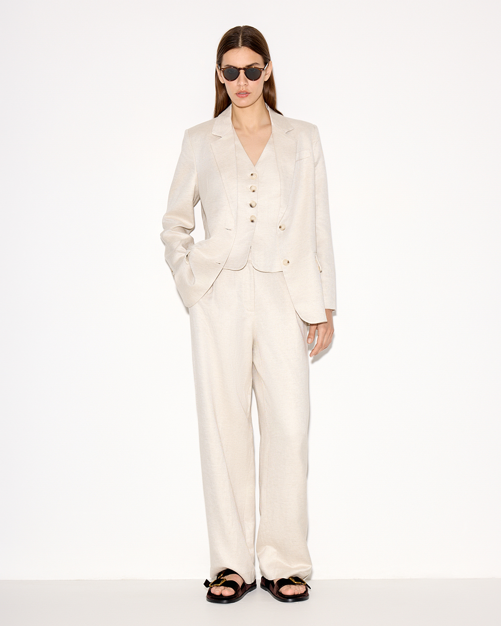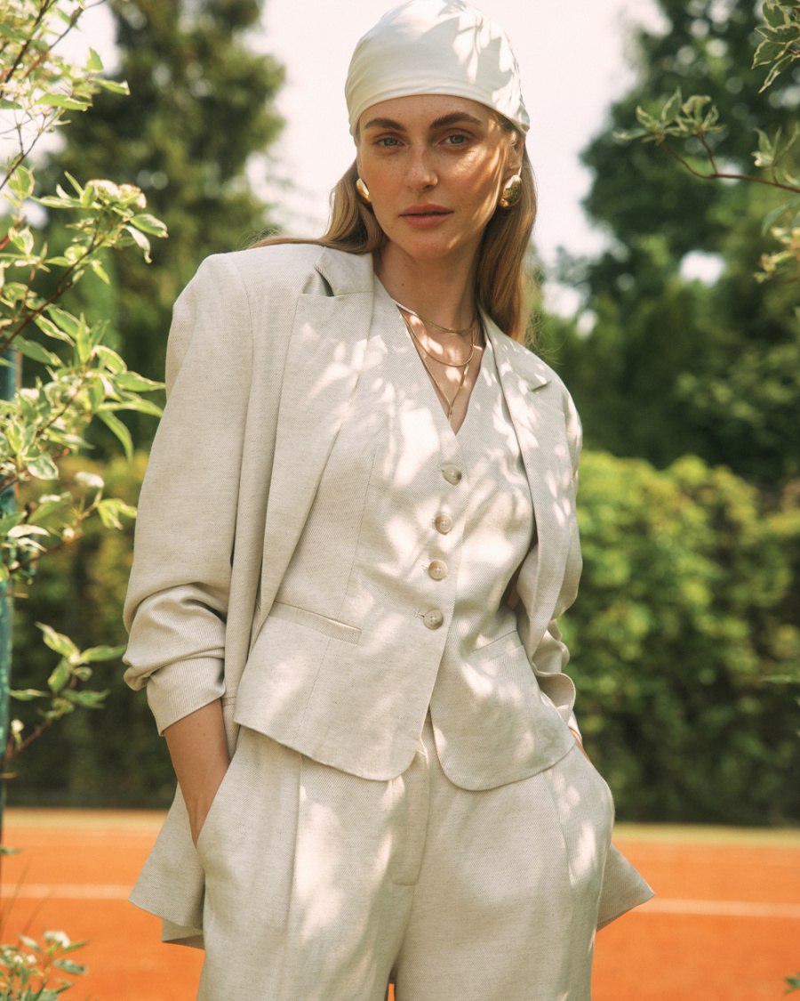 Благодаря составу - вискоза со льном - комфортная натуральная дышащая летняя ткань выглядит изысканно и благородно. Четкий, графичный крой жакета делает его, особенно в сочетании с комплектным жилетом и брюками или шортами, идеальным решением для летних деловых встреч и других мероприятий.