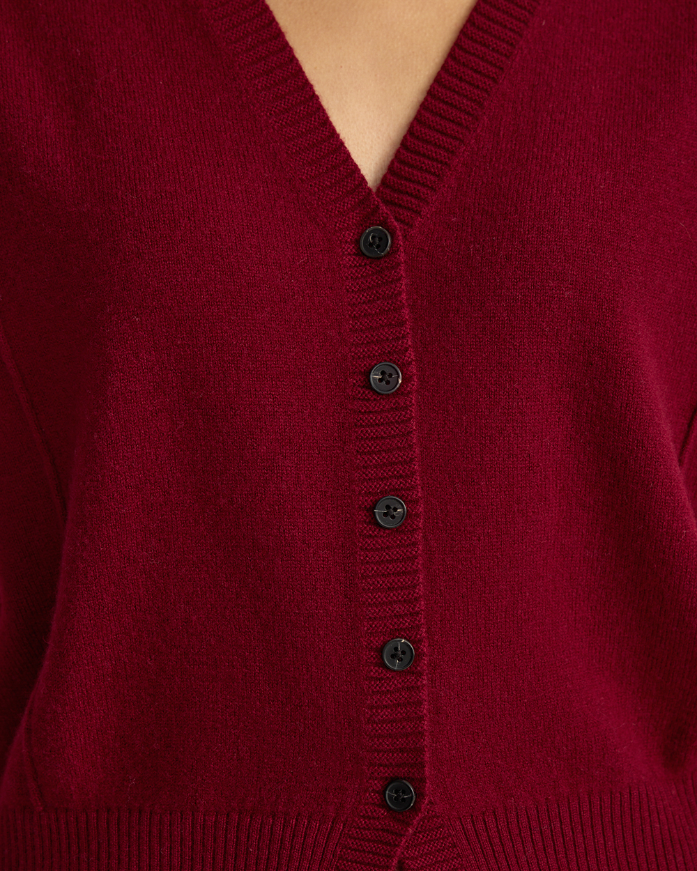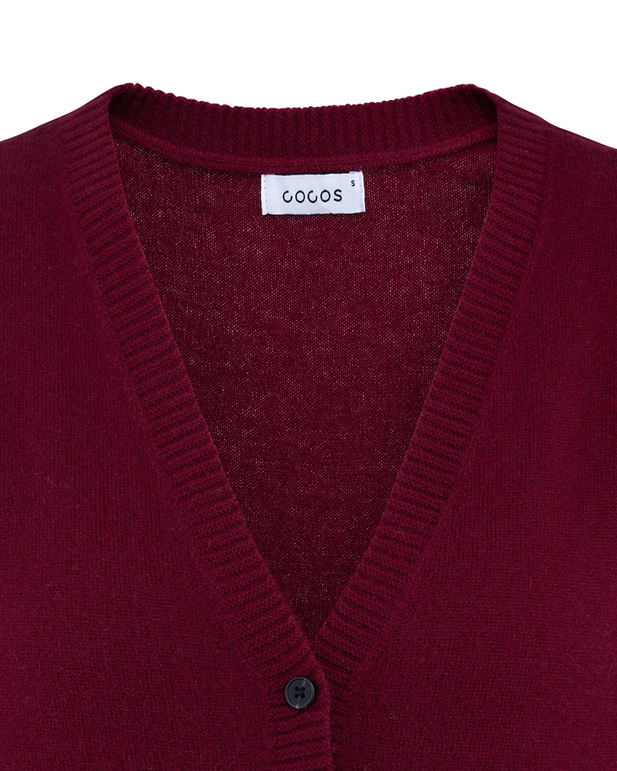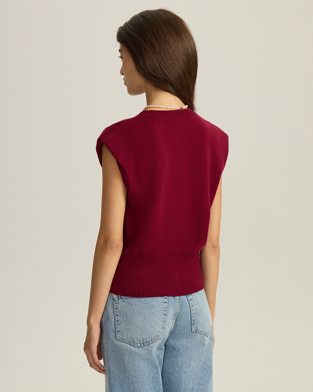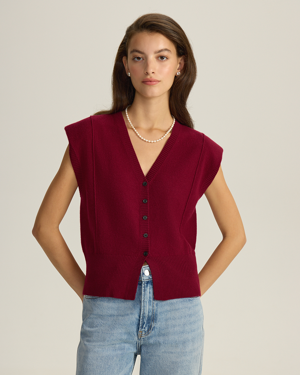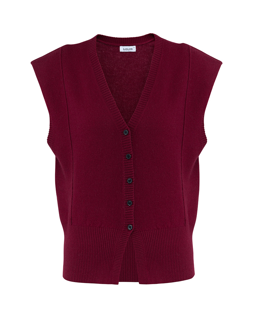 Шерстяной трикотажный жилет приталенного кроя на пуговицах. V-образный вырез. Эластичные края. Чуть расширенная линия плеча помогает создать X-образный силуэт. Актуальный акцентный бордовый цвет.