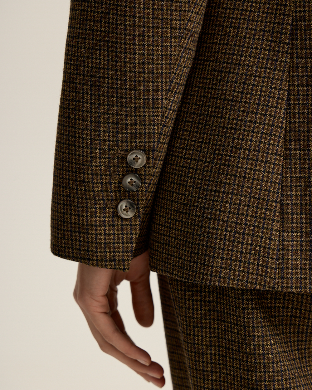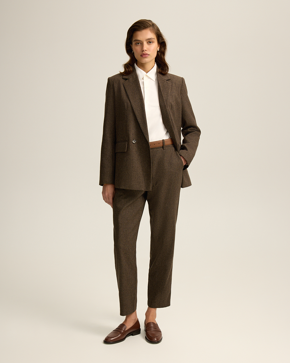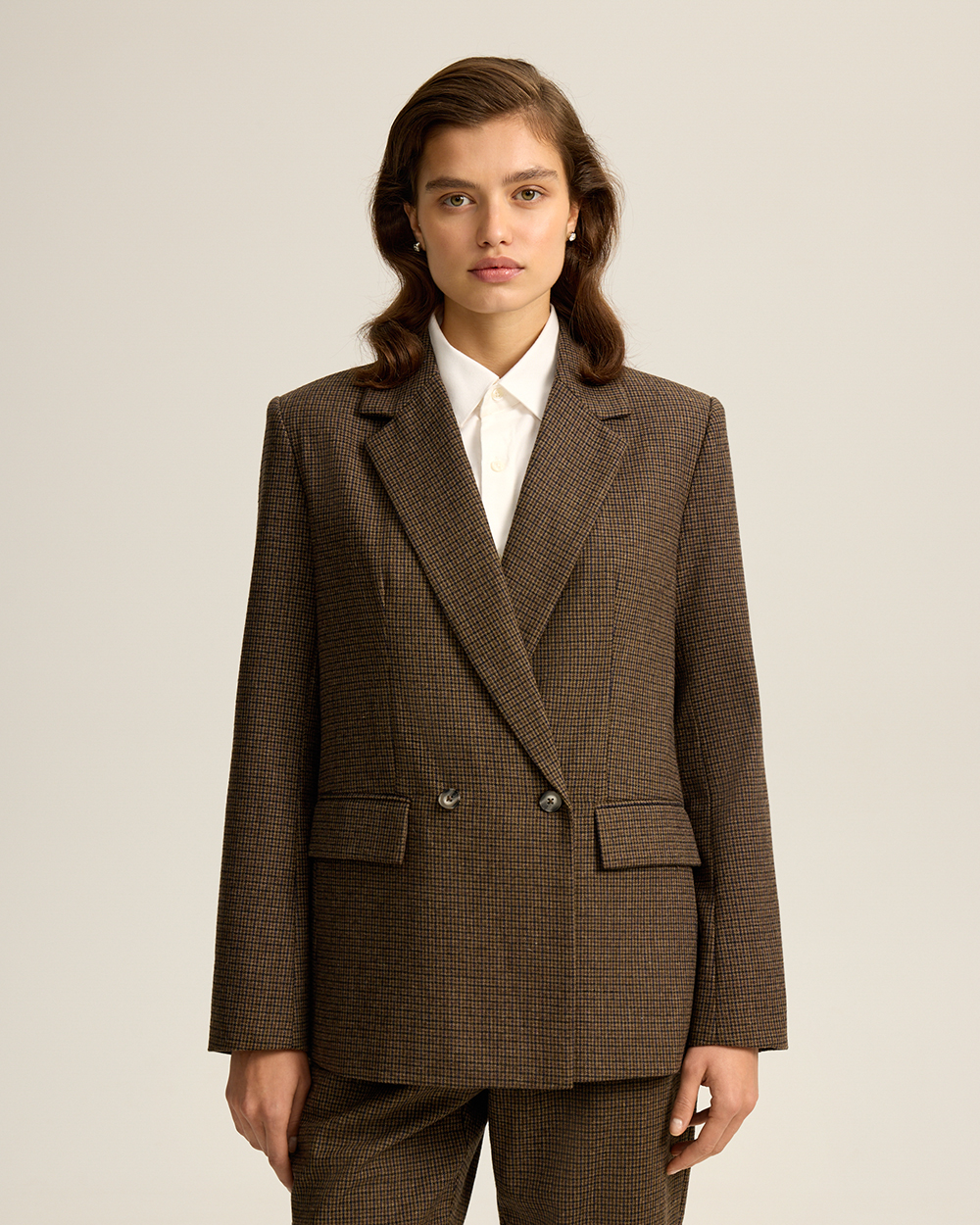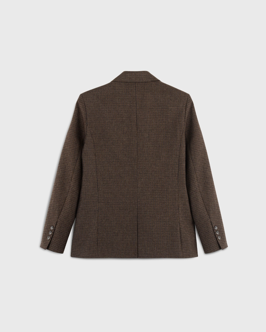Жакет прямого кроя из костюмной ткани с шерстью — переосмысленная классика с намёком на традиционный твид “хаундстут”. Английские лацканы и карманы с клапанами. Комфортная подкладка из тенселя и вискозы.