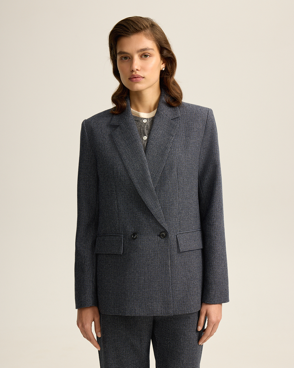 Жакет прямого кроя из костюмной ткани с шерстью — переосмысленная классика с намёком на традиционный твид “хаундстут”. Английские лацканы и карманы с клапанами. Комфортная подкладка из тенселя и вискозы.