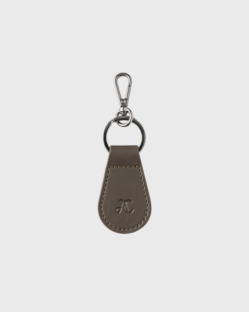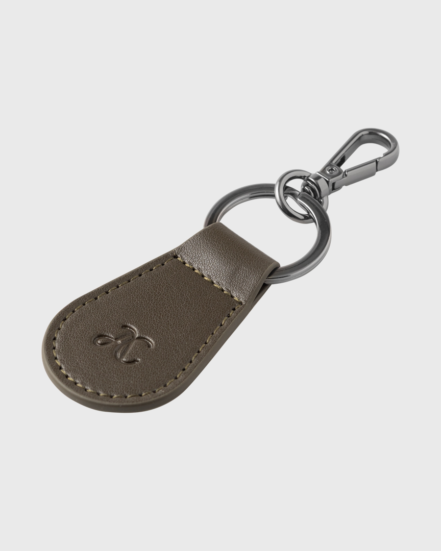 Лаконичный брелок из натуральной гладкой кожи цвета хаки, с тиснением монограммы AC c одной стороны и лого ABRAU CLUB с другой. С кольцом и карабином из темного никеля.