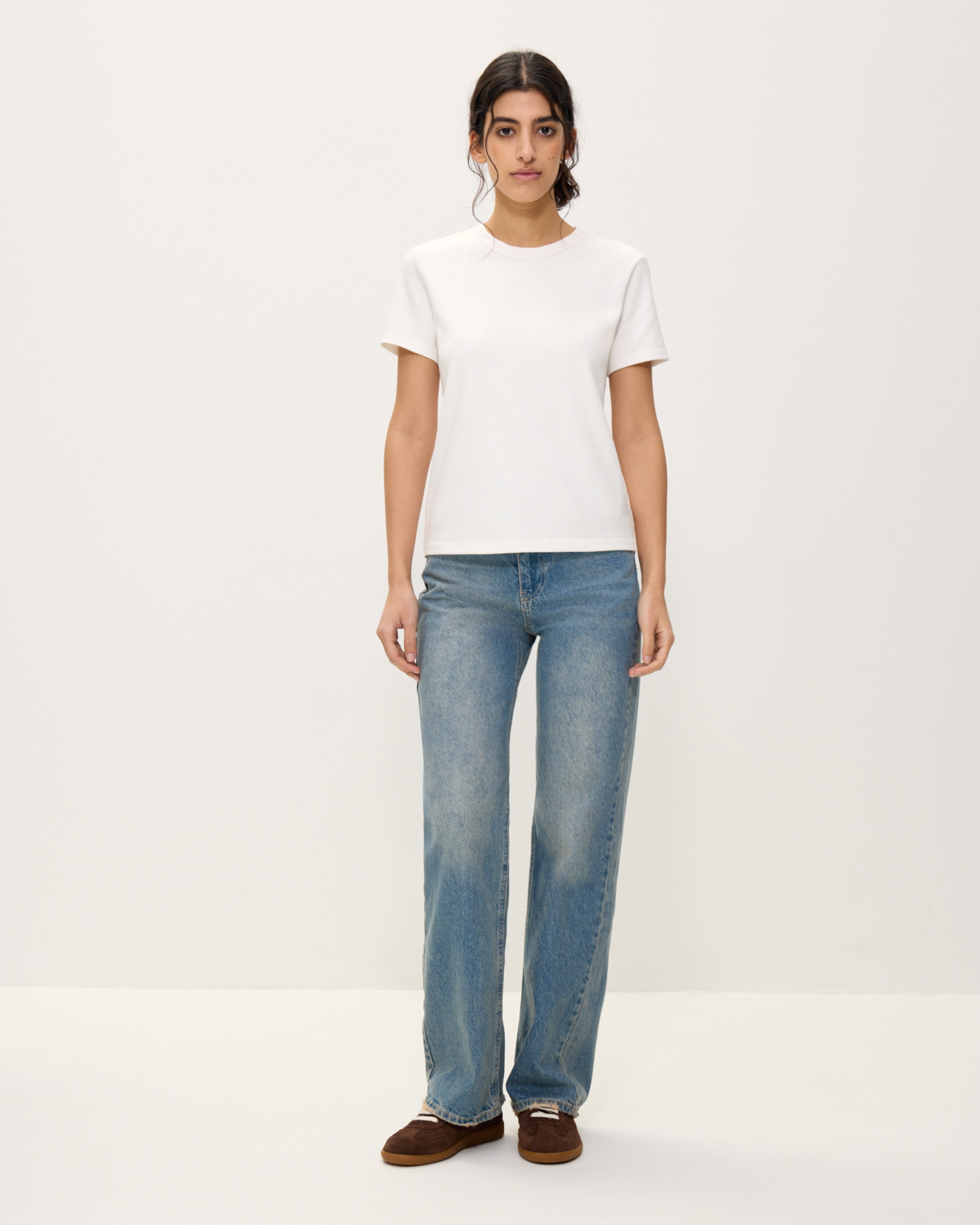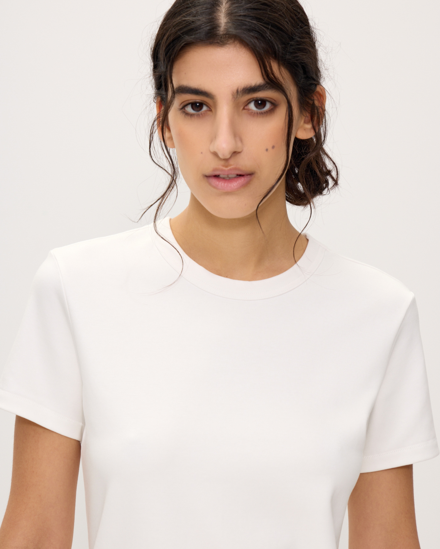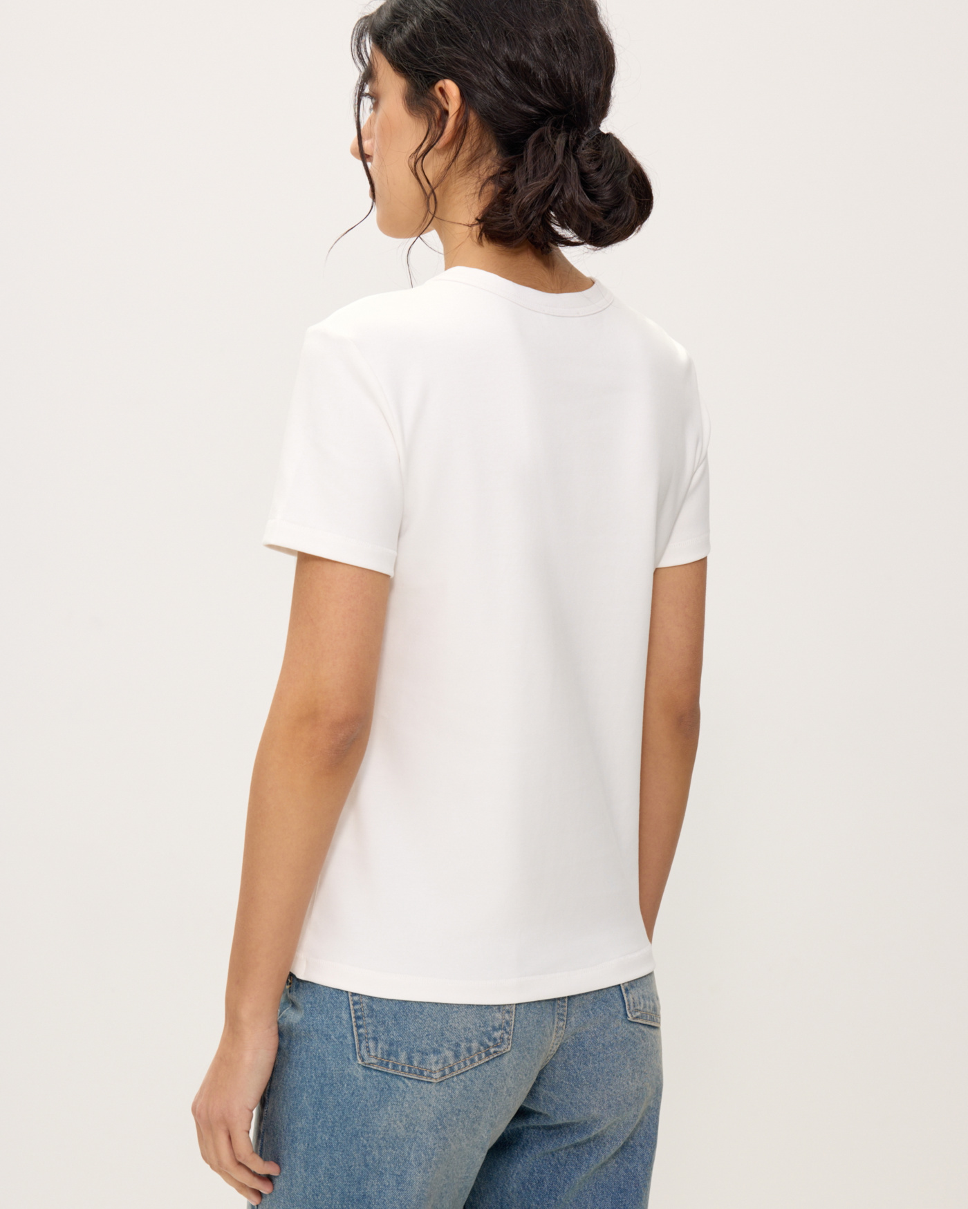 Футболка из эластичного хлопкового джерси. Круглый вырез. Короткие рукава. Футболка классической посадки, приталенного кроя, без оверсайз эффекта, с аккуратной линией ворота. Отлично подойдет как база под жакеты, кардиганы, рубашки, а также для тех самых многослойных сочетаний под джемперы и свитшоты, с воротником на молнии или без, когда контрастный ярко-белый край футболки выглядывает из-под ворота.