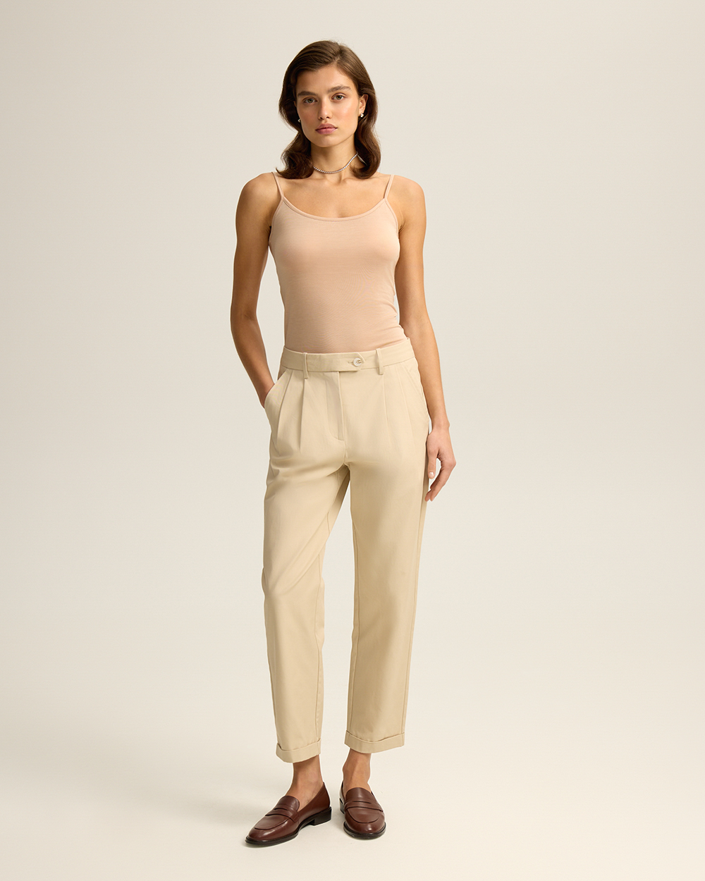 Чиносы из лёгкого гладкого хлопкового твила в светло-бежевом оттенке — универсальная база с характером. Зауженный крой с отворотами придаёт образу аккуратность и завершённость. Средняя посадка сочетает удобство и классическую элегантность.