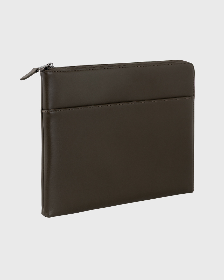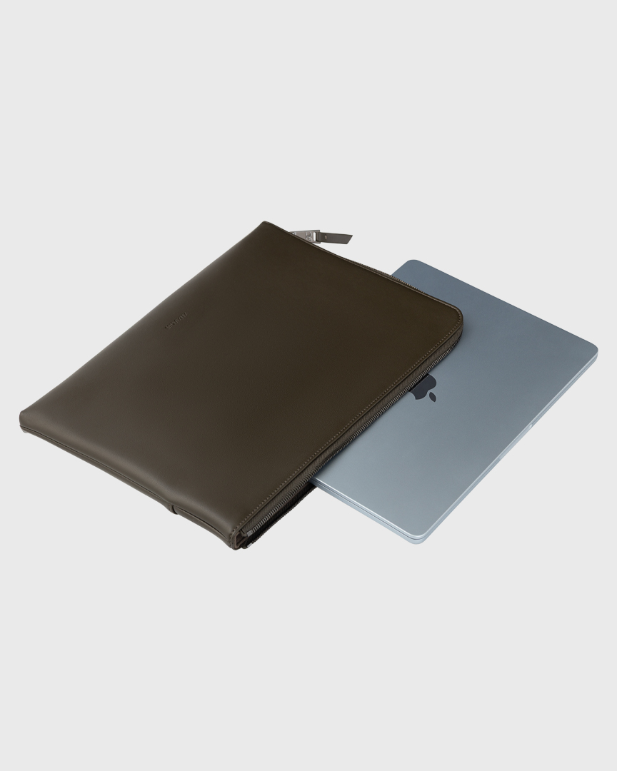 Минималистичный чехол для ноутбука с диагональю 14, на молнии, с внешним карманом на магните. Выполнен из натуральной гладкой кожи цвета хаки, с тиснением лого ABRAU CLUB, на хлопковой подкладке. Пуллер на молнии из темного никеля дополнен гравировкой монограммы АС.