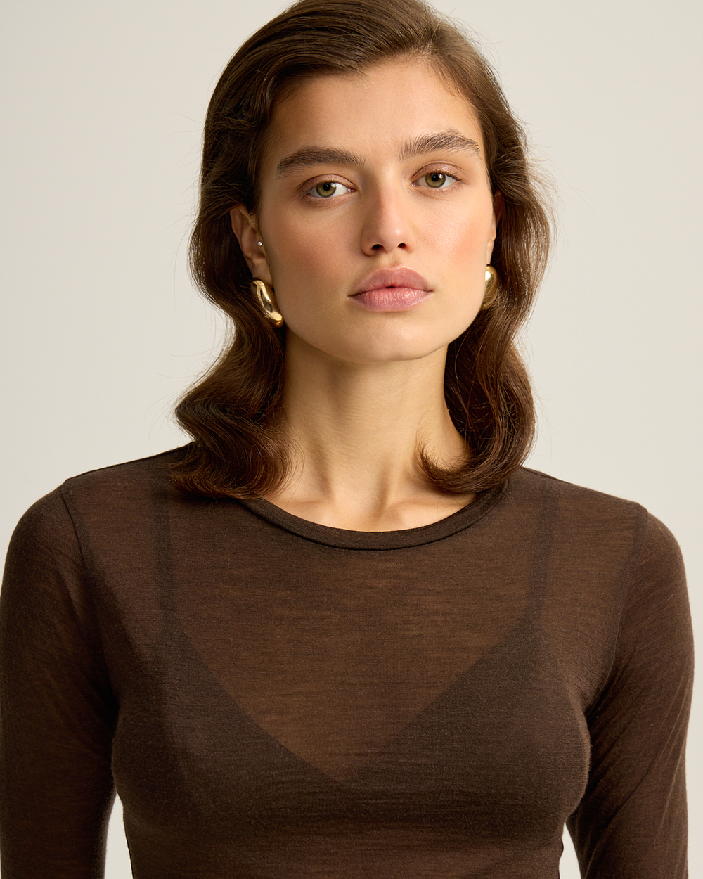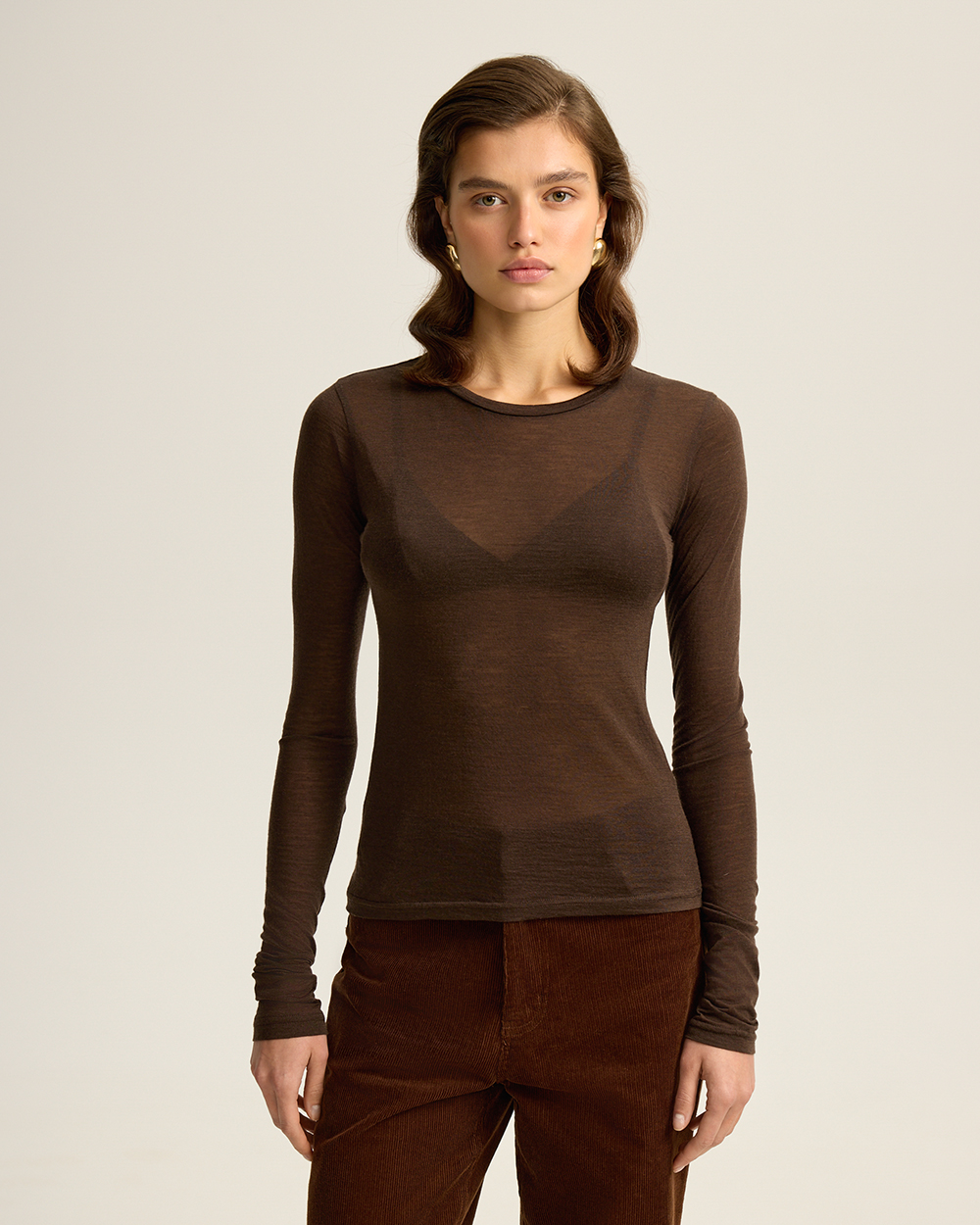Прозрачный лонгслив из тончайшей шерсти мериноса — деликатная основа гардероба, играющая роль «второй кожи». Прозрачность придает образу утончённости и лёгкой пикантности, сохраняя при этом ощущение благородного минимализма.