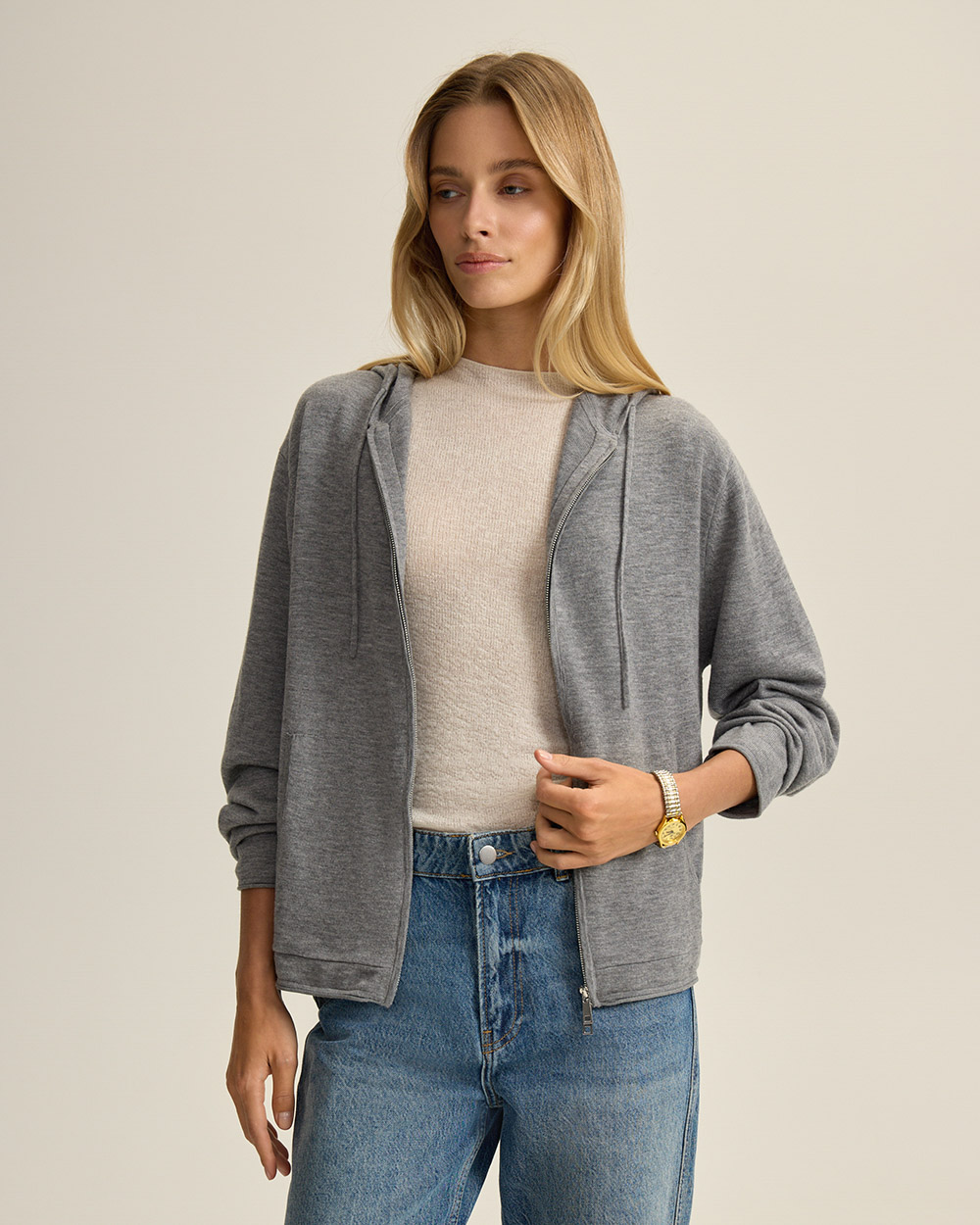 Вязаный кардиган-худи на молнии из 100% шерсти. Модель с капюшоном и карманами «кенгуру» — мягкий, теплый и универсальный. Двойная молния (замок сверху и снизу) позволяет легко варьировать силуэт и создавать многослойные образы.