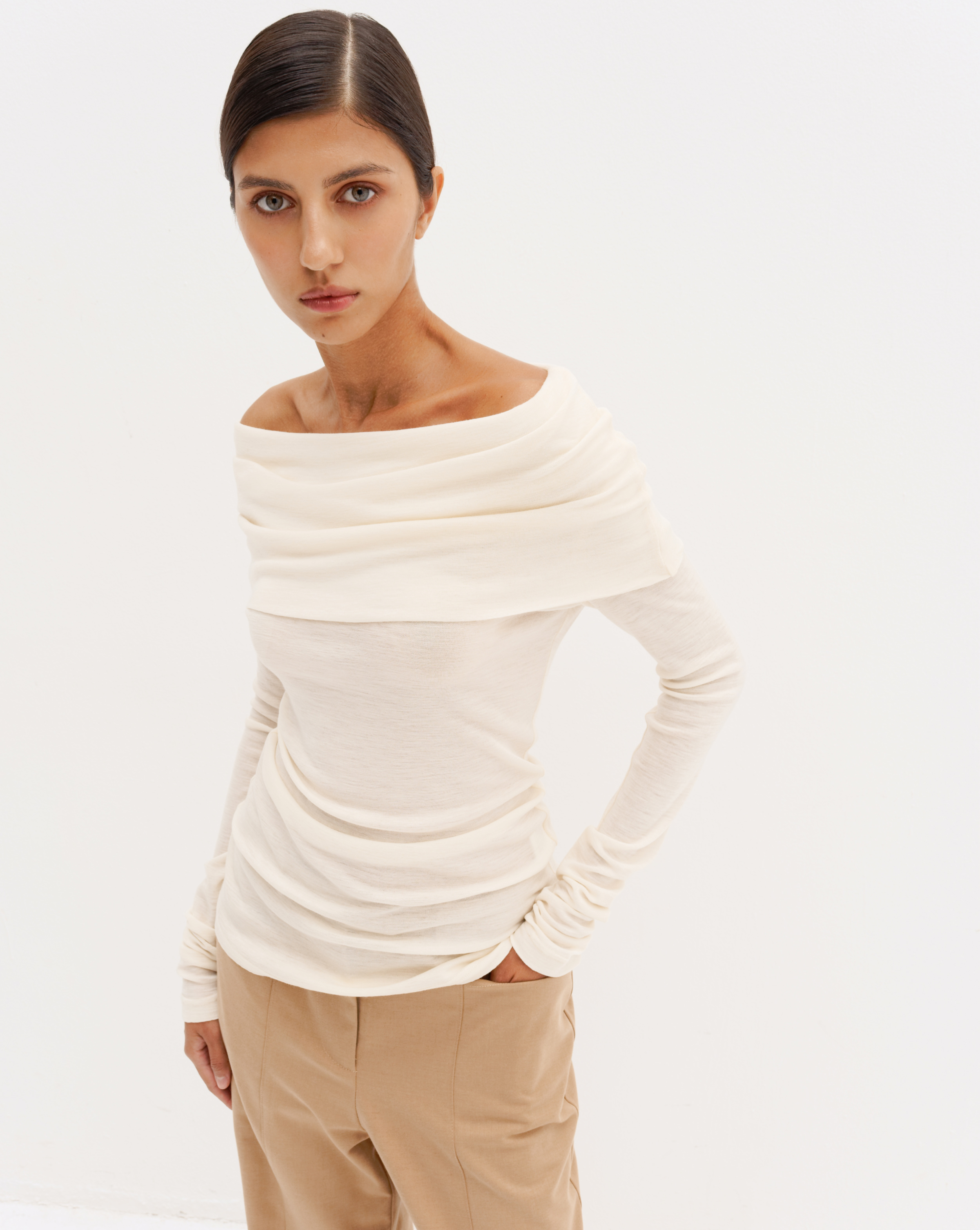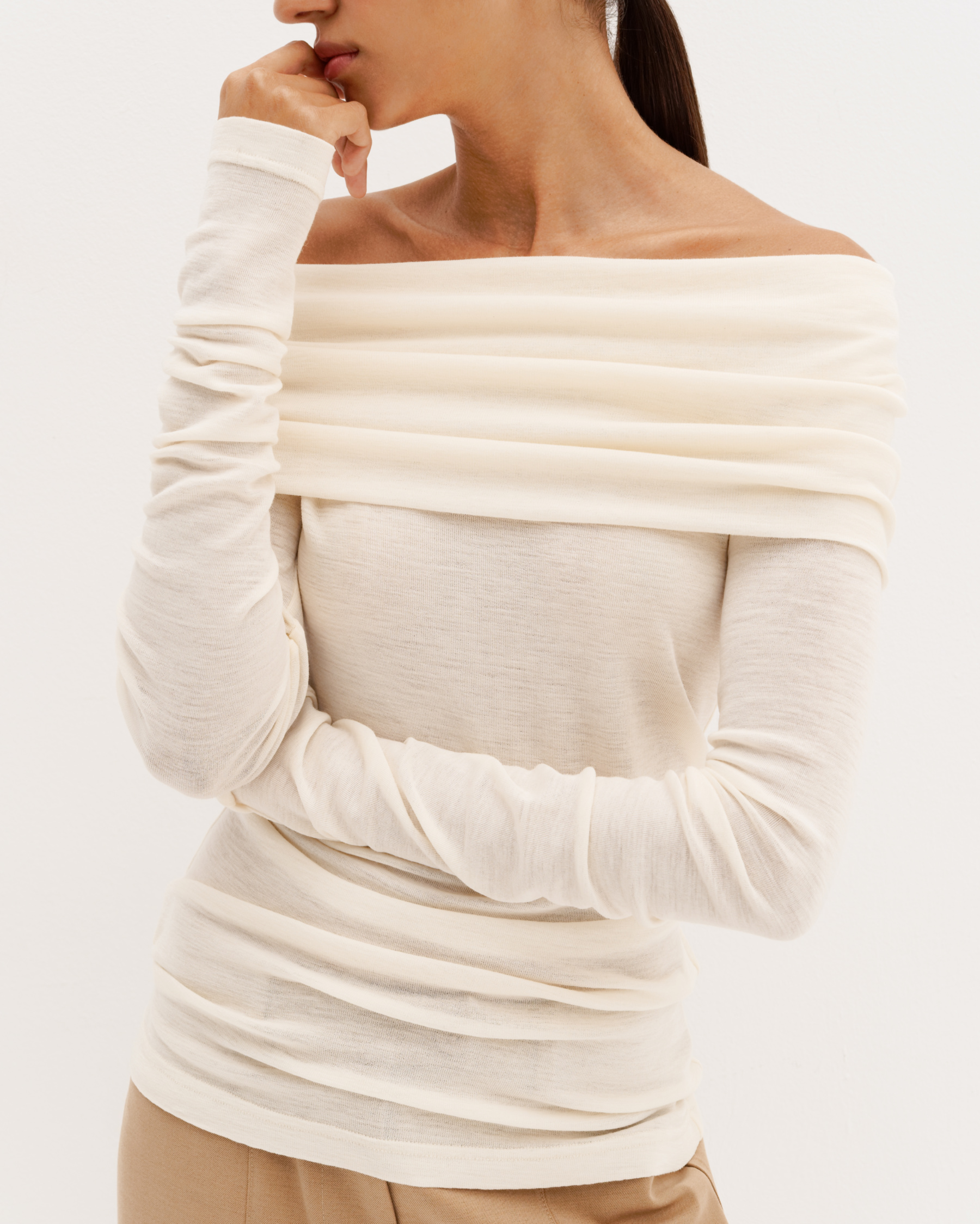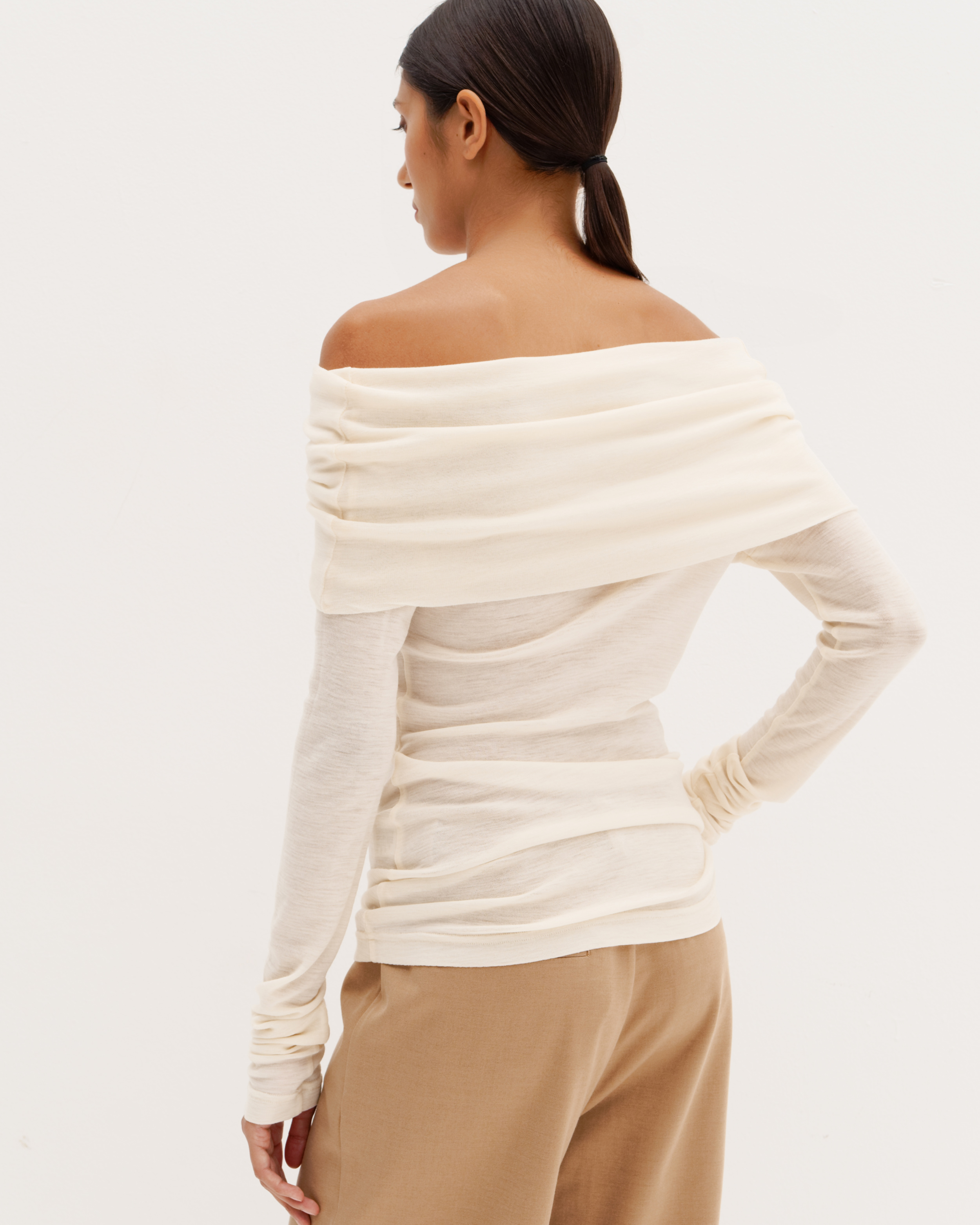 Шерстяной лонгслив с открытыми плечами, трансформер, молочный