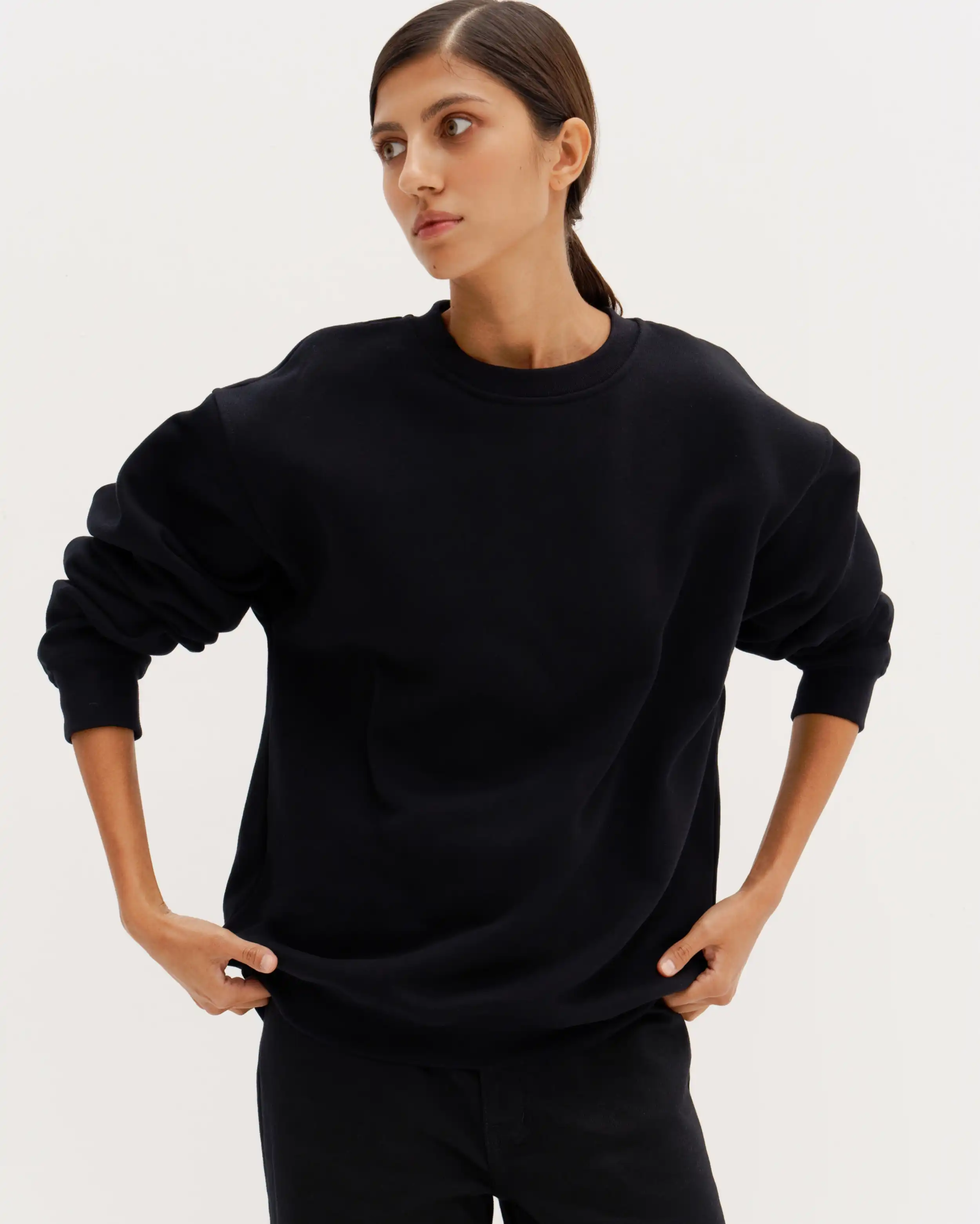 Свитшот oversize со спущенным плечом, из нового мягкого хлопкового футера. Круглый вырез, длинные рукава. Эластичные манжеты.