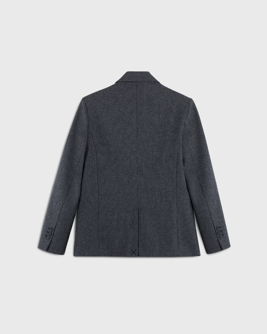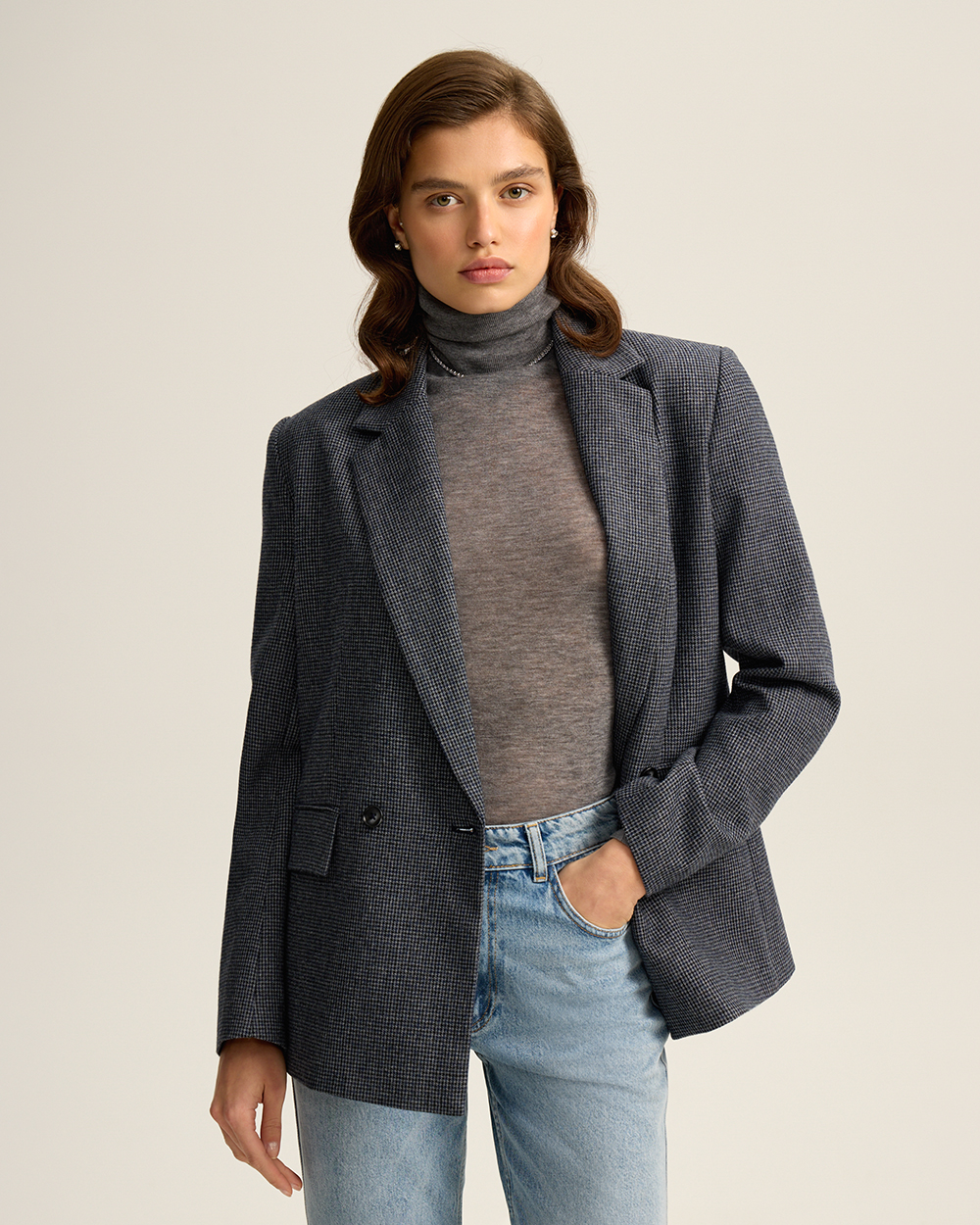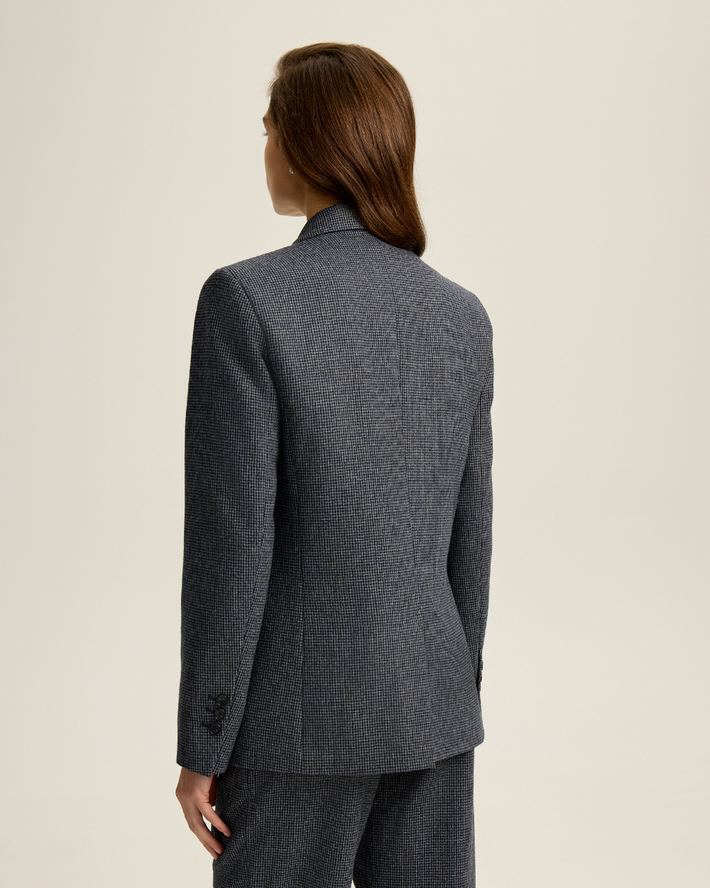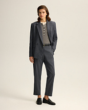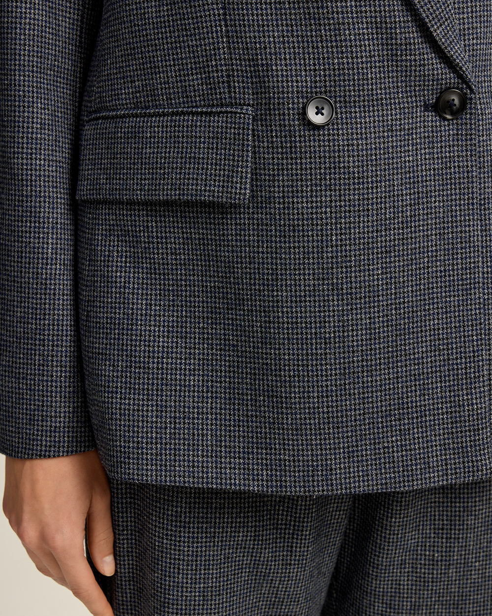 Жакет прямого кроя из костюмной ткани с шерстью — переосмысленная классика с намёком на традиционный твид “хаундстут”. Английские лацканы и карманы с клапанами. Комфортная подкладка из тенселя и вискозы.