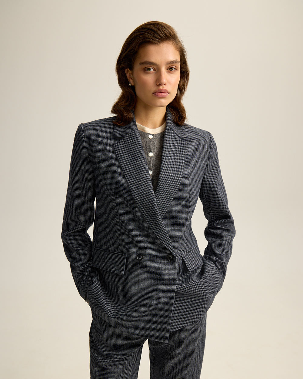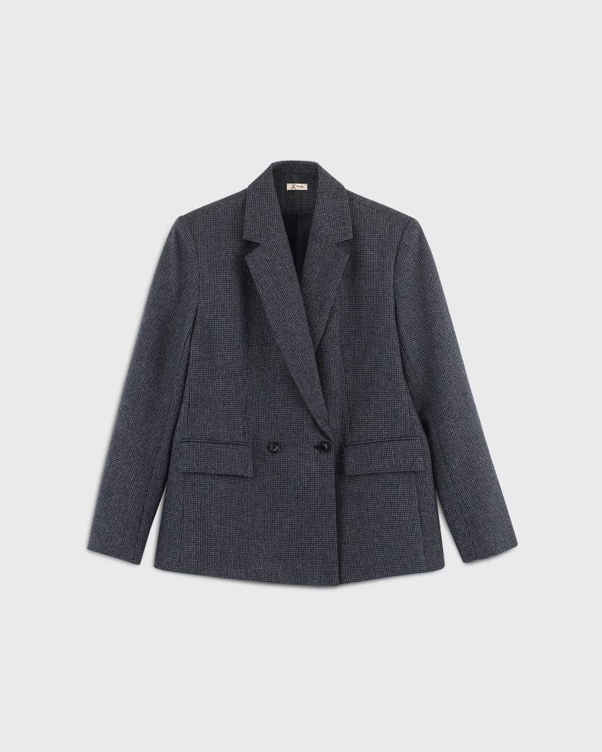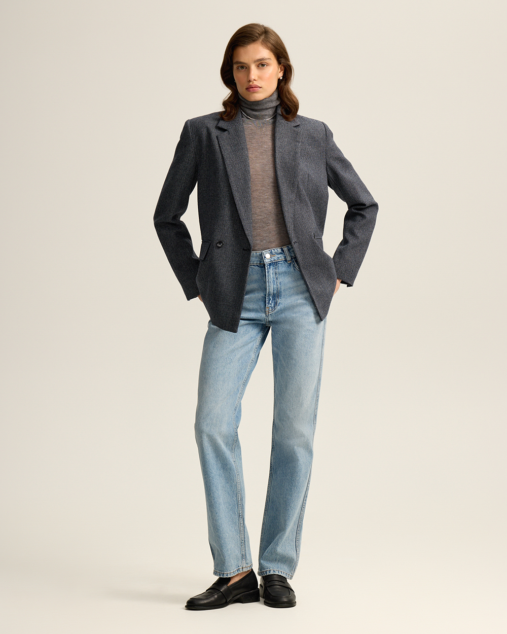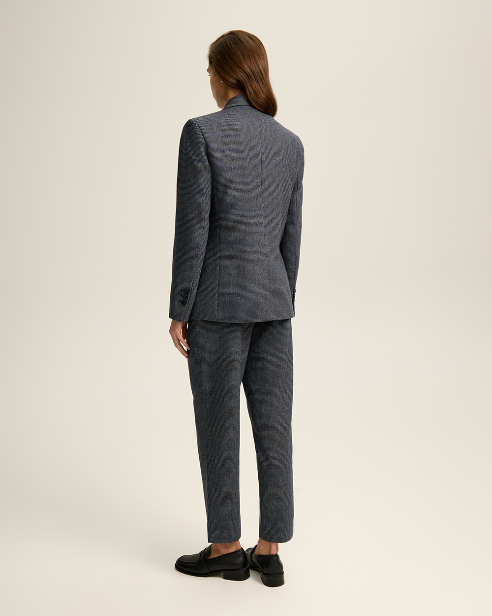 Жакет прямого кроя из костюмной ткани с шерстью — переосмысленная классика с намёком на традиционный твид “хаундстут”. Английские лацканы и карманы с клапанами. Комфортная подкладка из тенселя и вискозы.