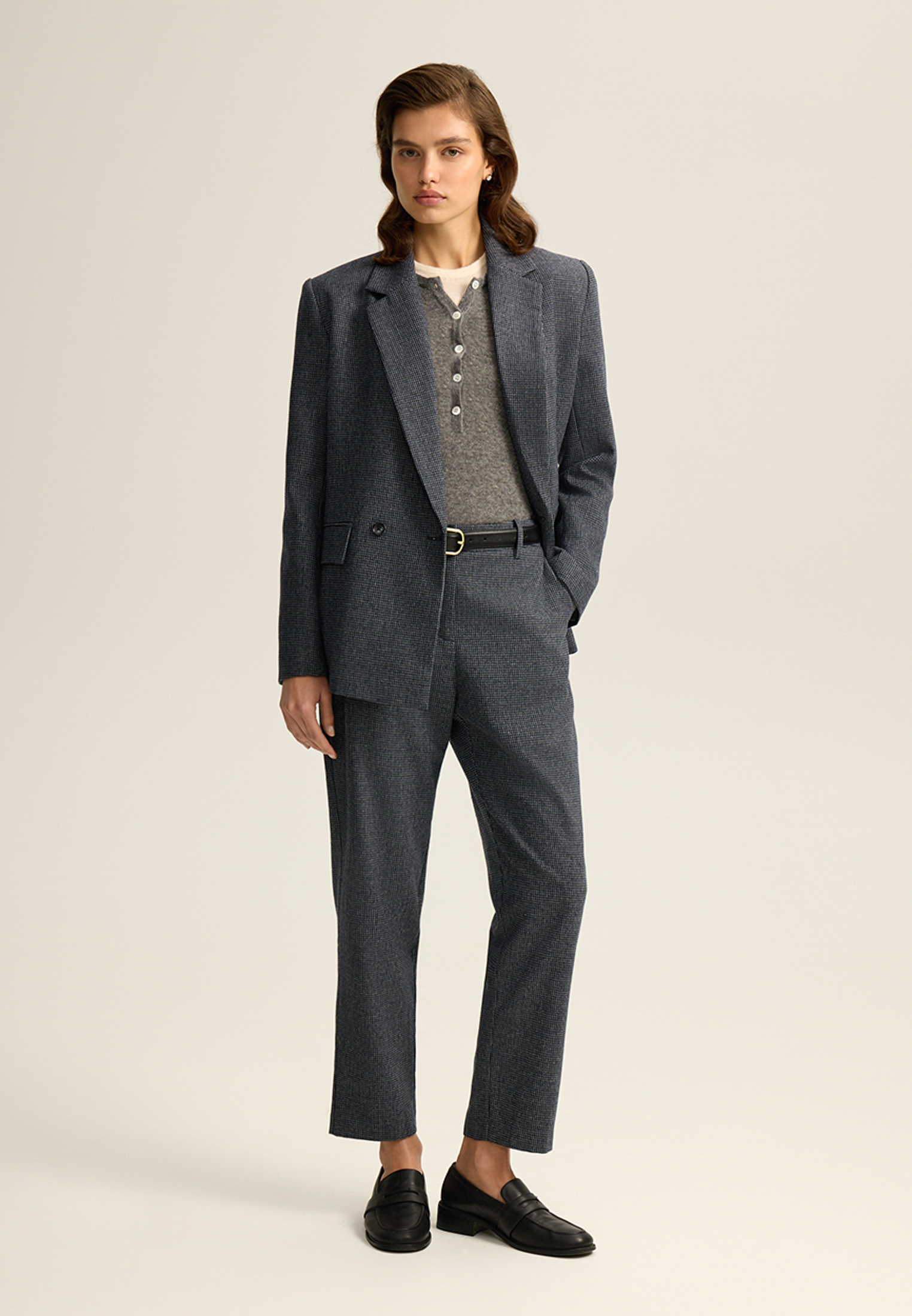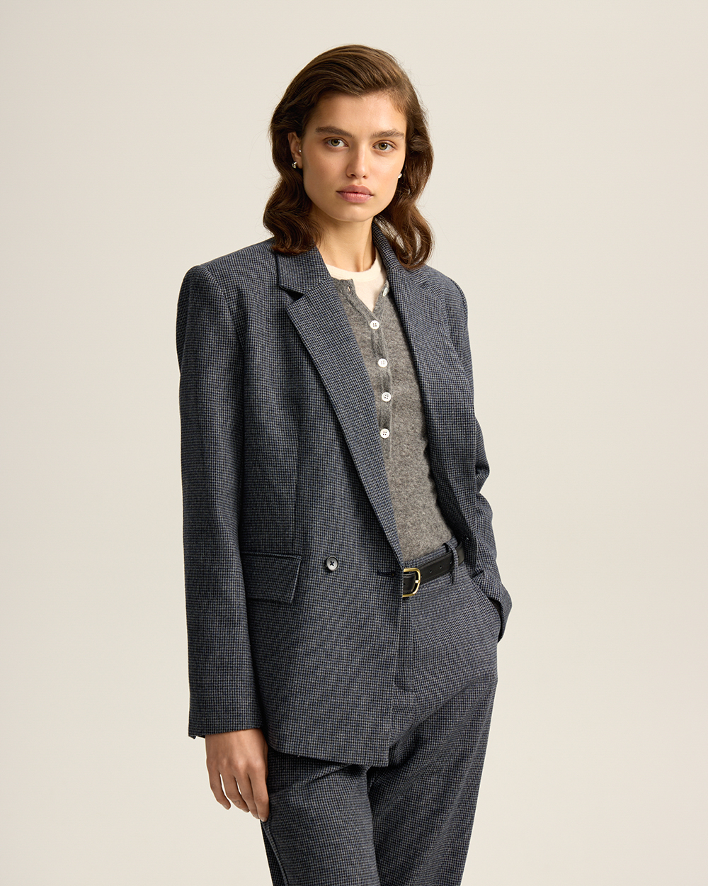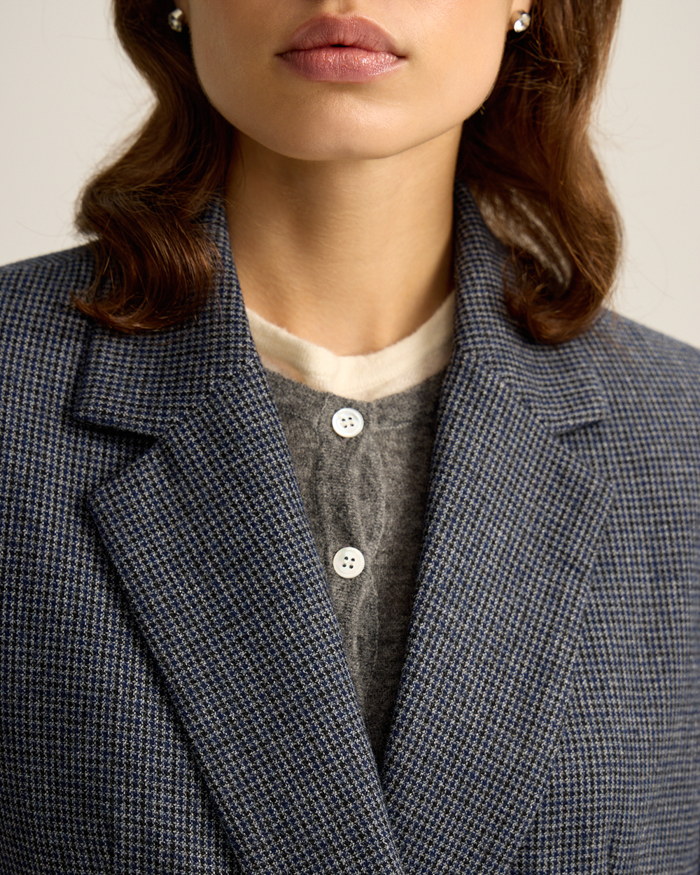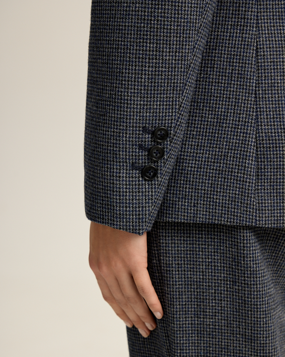 Жакет прямого кроя из костюмной ткани с шерстью — переосмысленная классика с намёком на традиционный твид “хаундстут”. Английские лацканы и карманы с клапанами. Комфортная подкладка из тенселя и вискозы.