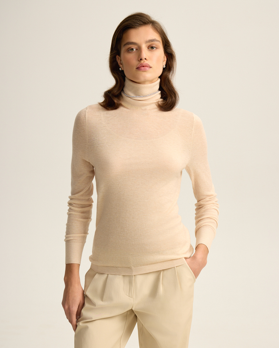 Водолазка из тонкой смесовой шерсти. Слегка прозрачный эффект деликатного материала придаёт образу изысканность. Благодаря благородной ткани будет эффектно смотреться не только как лаконичная база под жакет или кардиган, но и как самодостаточный трикотажный верх.