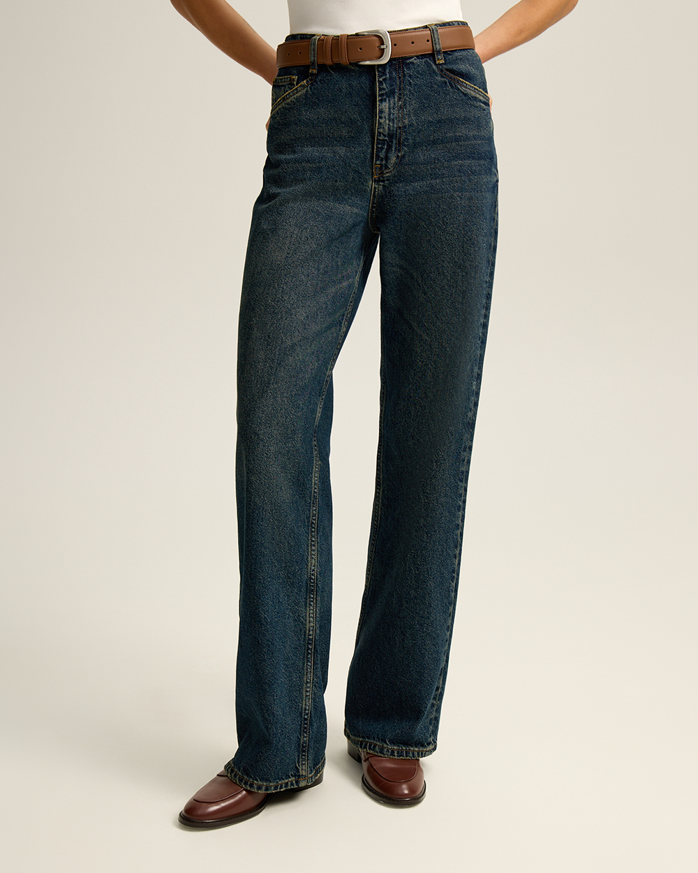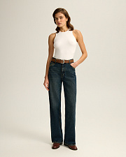 Джинсы прямого кроя с высокой посадкой. Комфортный деним из 100% хлопка с легким эффектом потертостей. “Скошенные” карманы спереди, карманы сзади.