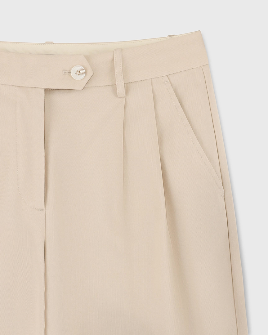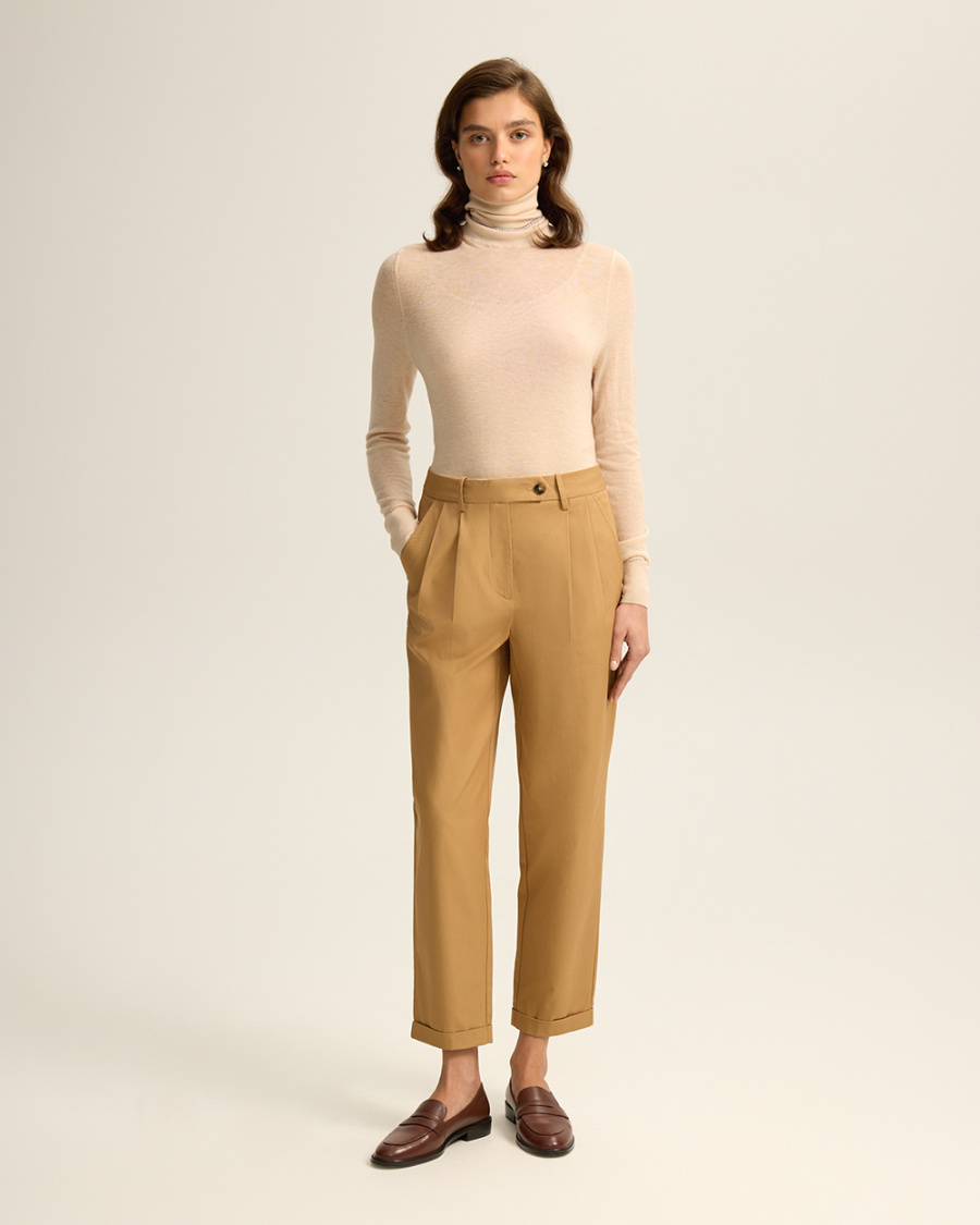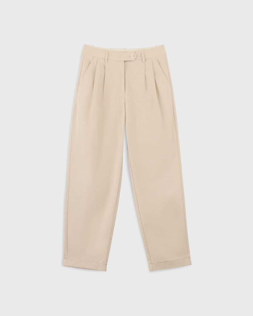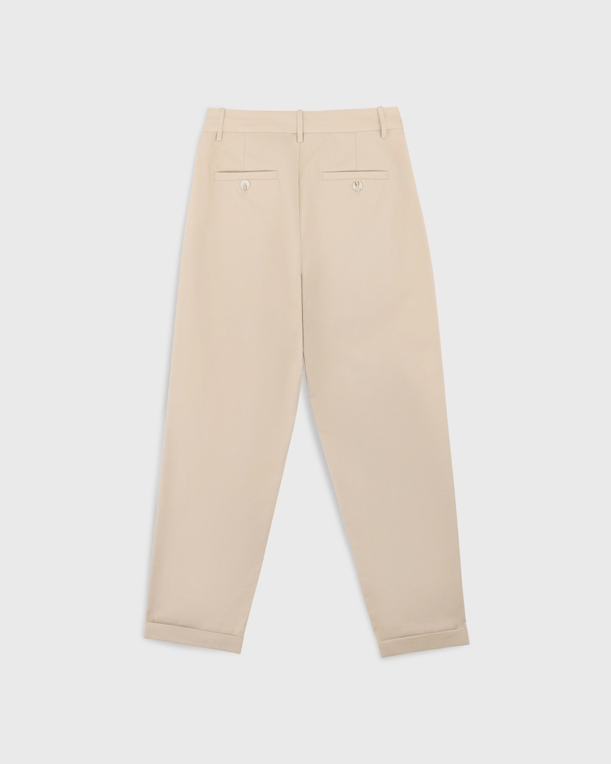 Чиносы из лёгкого гладкого хлопкового твила в светло-бежевом оттенке — универсальная база с характером. Зауженный крой с отворотами придаёт образу аккуратность и завершённость. Средняя посадка сочетает удобство и классическую элегантность.