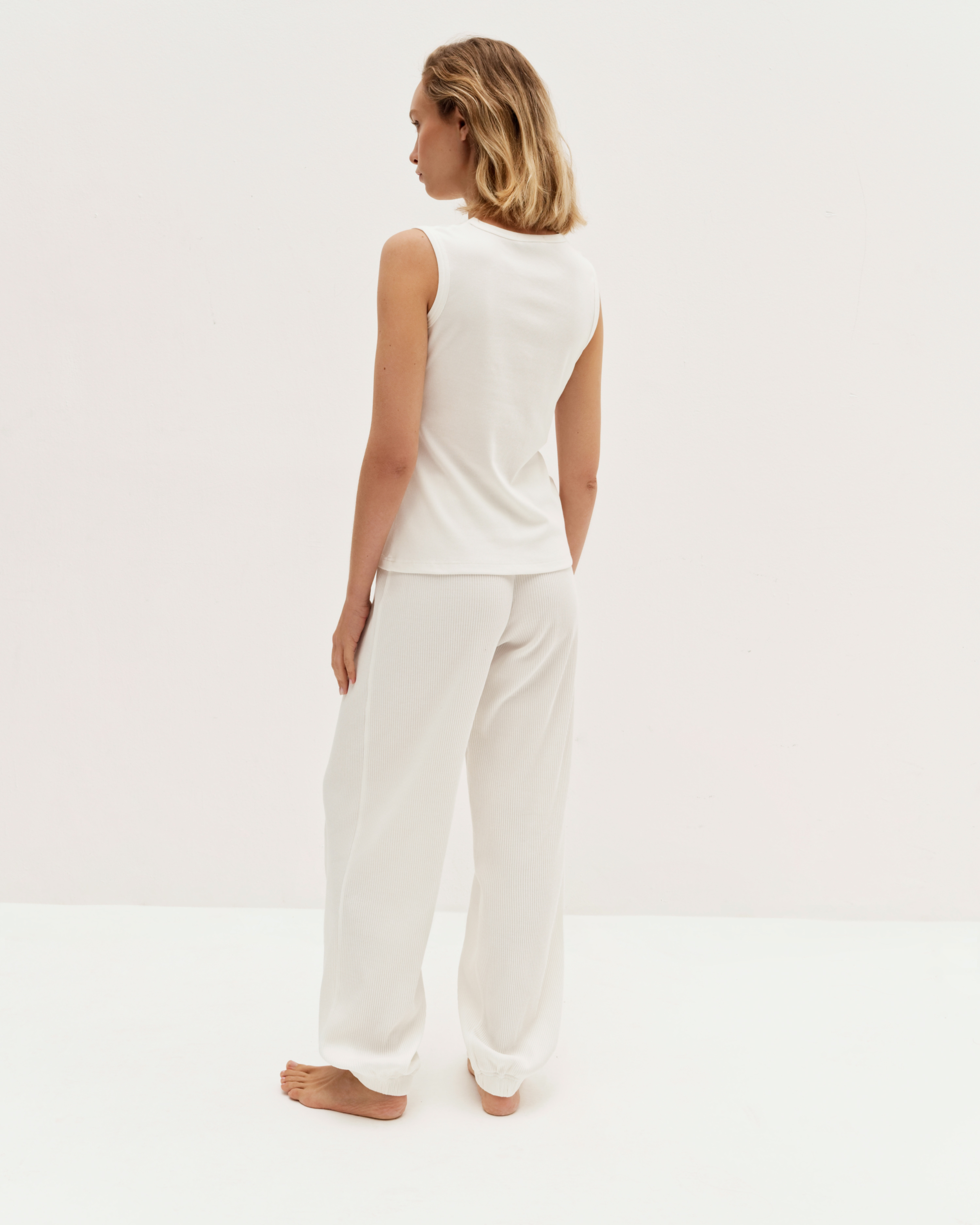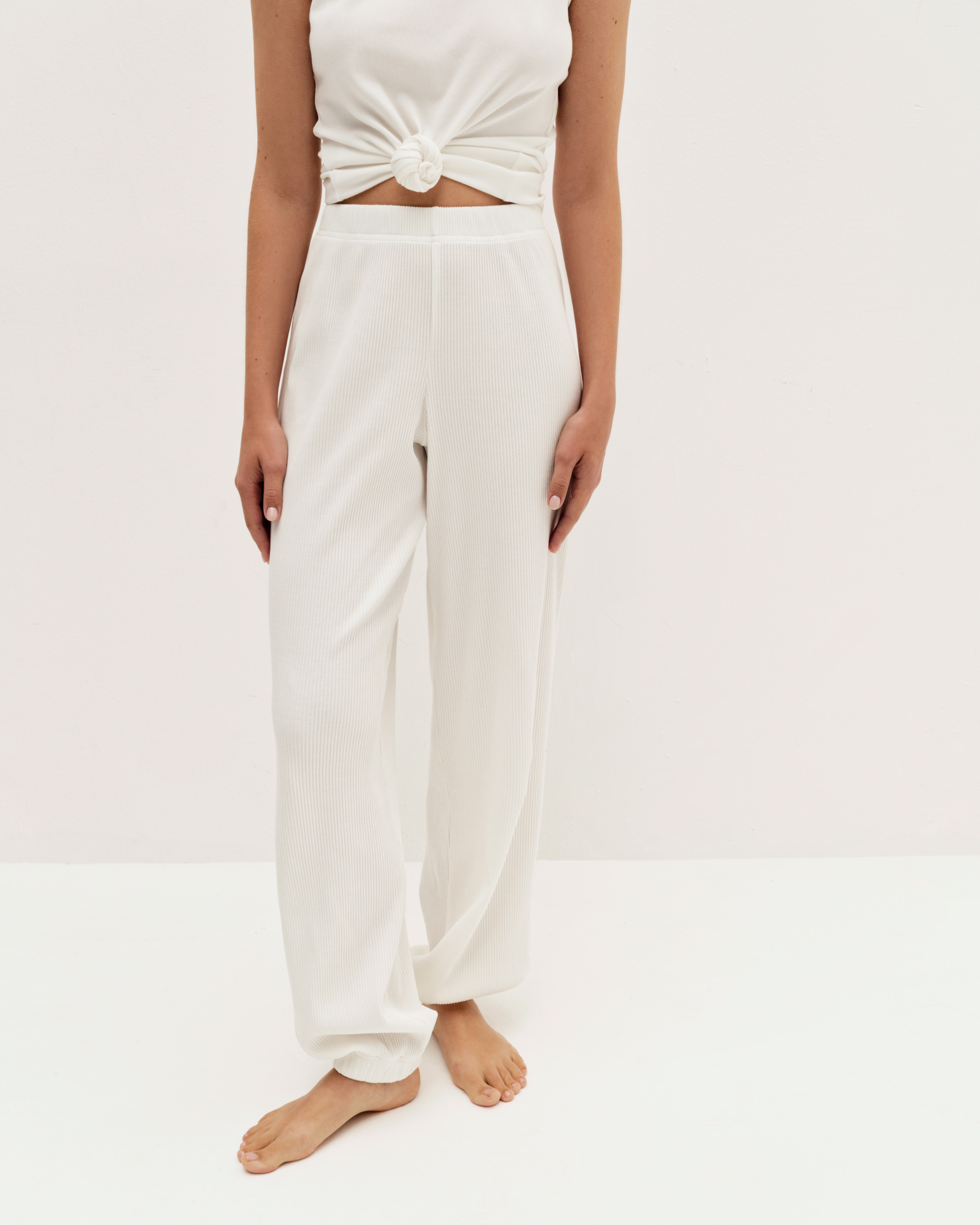 Брюки-джоггеры в мелкий рубчик, из хлопка с добавлением лайкры. Резинка на талии и по низу изделия обеспечивают комфортную посадку. Брюки отлично подходят для повседневных и домашних образов. Соберите комплект с топом из нашей коллекции.