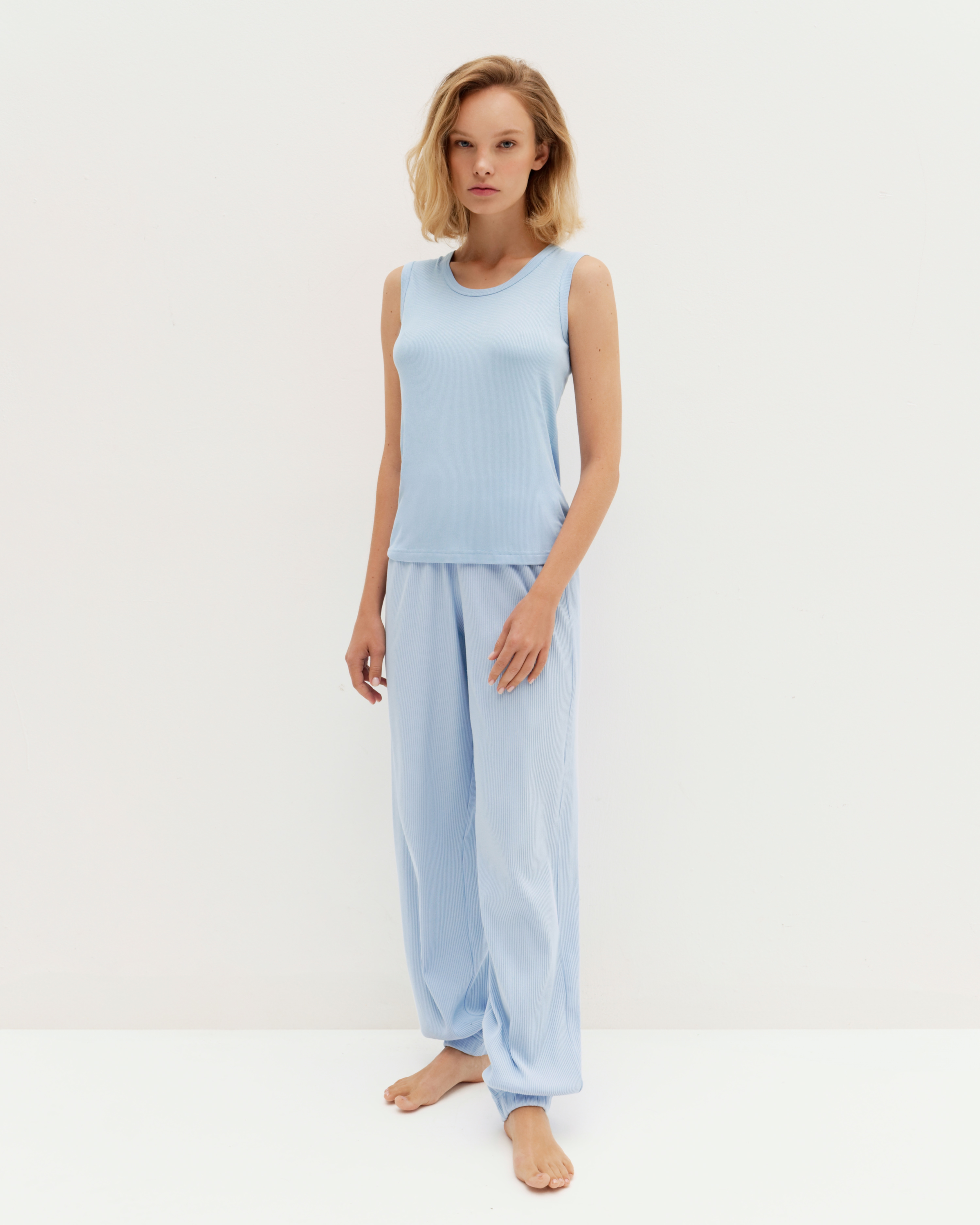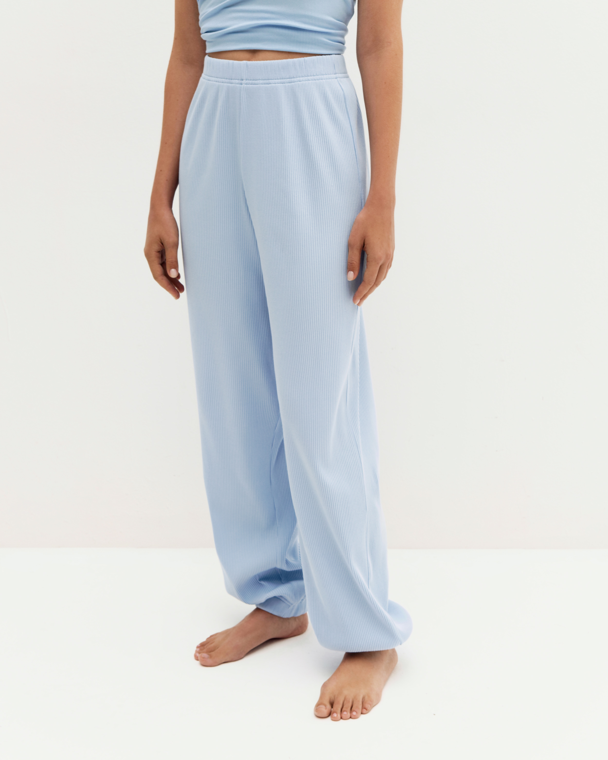 Брюки-джоггеры в мелкий рубчик, из хлопка с добавлением лайкры. Резинка на талии и по низу изделия обеспечивают комфортную посадку. Брюки отлично подходят для повседневных и домашних образов. Соберите комплект с топом из нашей коллекции.