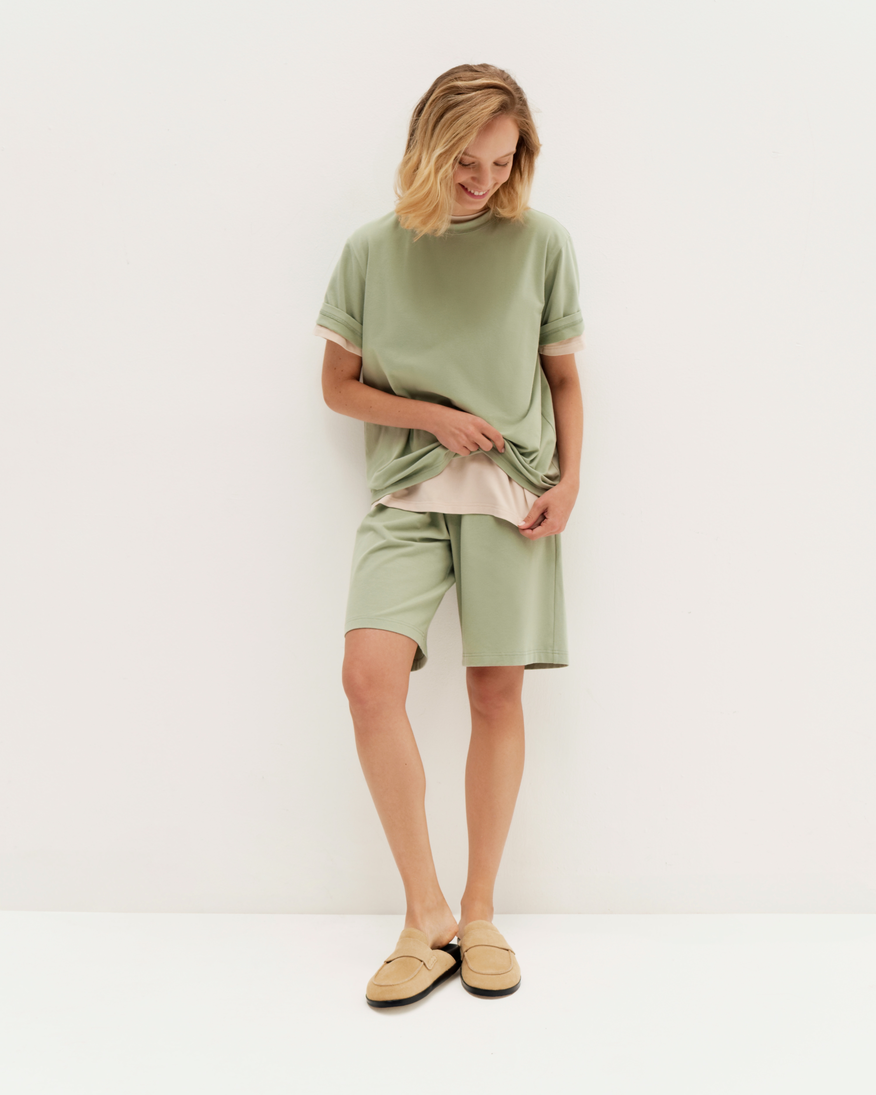 Свободные шорты с широким эластичным поясом — для отдыха дома или в путешествии. Соберите комплект с топом или футболкой из нашей коллекции. Очень мягкая и приятная к телу ткань из премиум хлопка с добавлением лайкры, с легким велюровым (peach) эффектом.