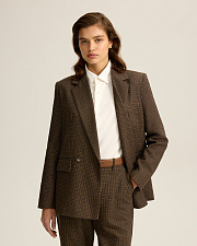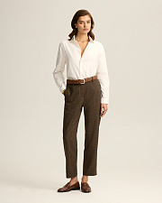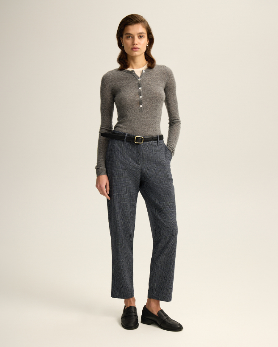 Классические брюки слегка зауженного кроя. Костюмная ткань с шерстью, напоминает традиционный твид “хаундстут”. Комфортная подкладка из тенселя и вискозы.