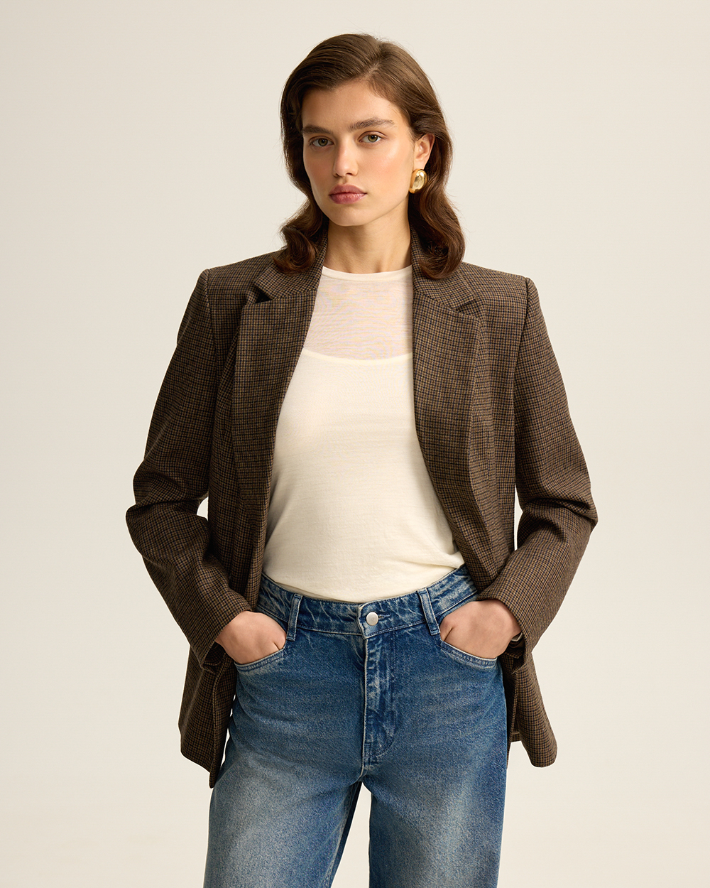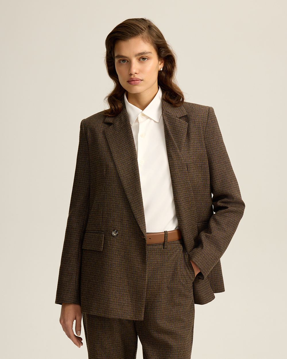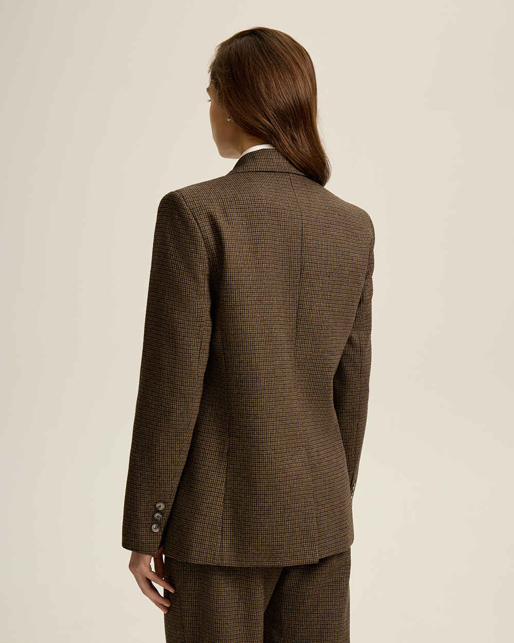 Жакет прямого кроя из костюмной ткани с шерстью — переосмысленная классика с намёком на традиционный твид “хаундстут”. Английские лацканы и карманы с клапанами. Комфортная подкладка из тенселя и вискозы.