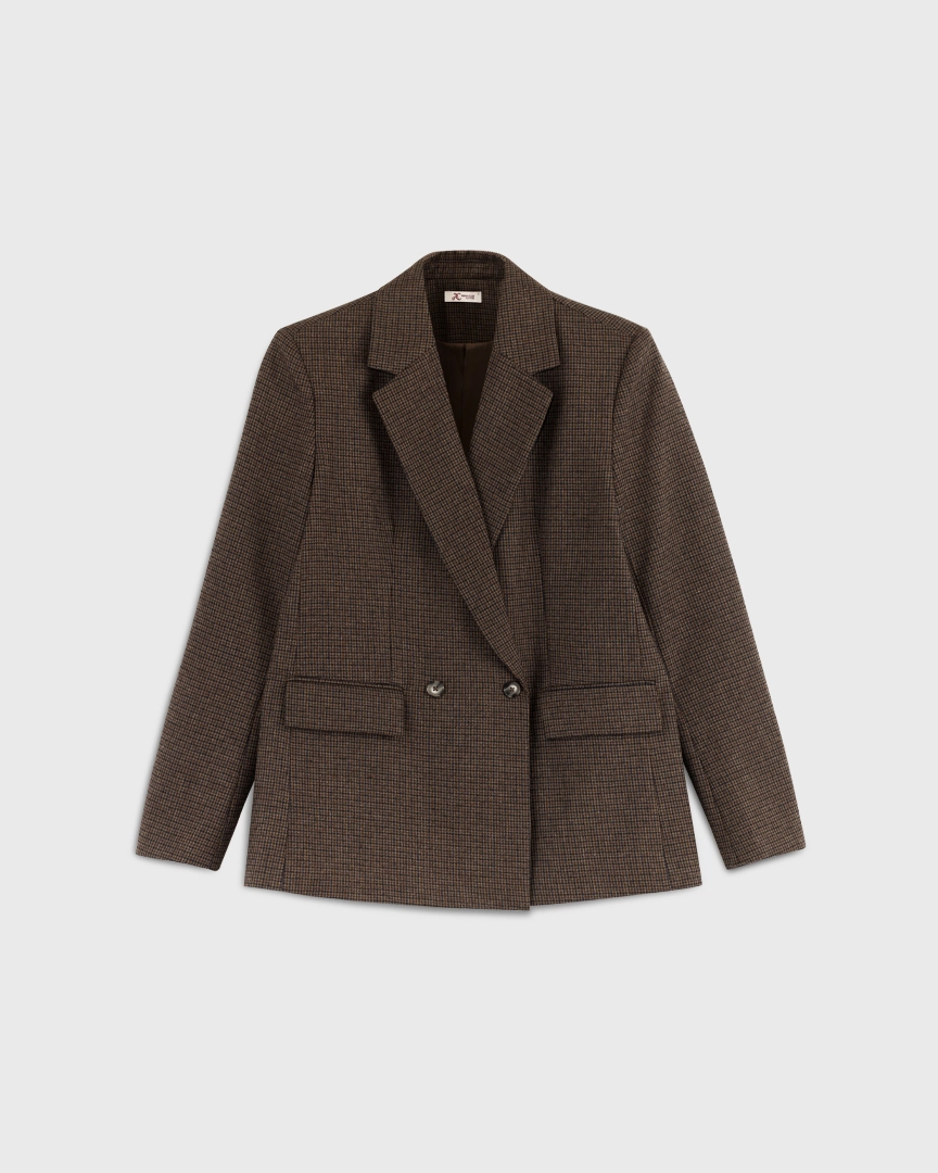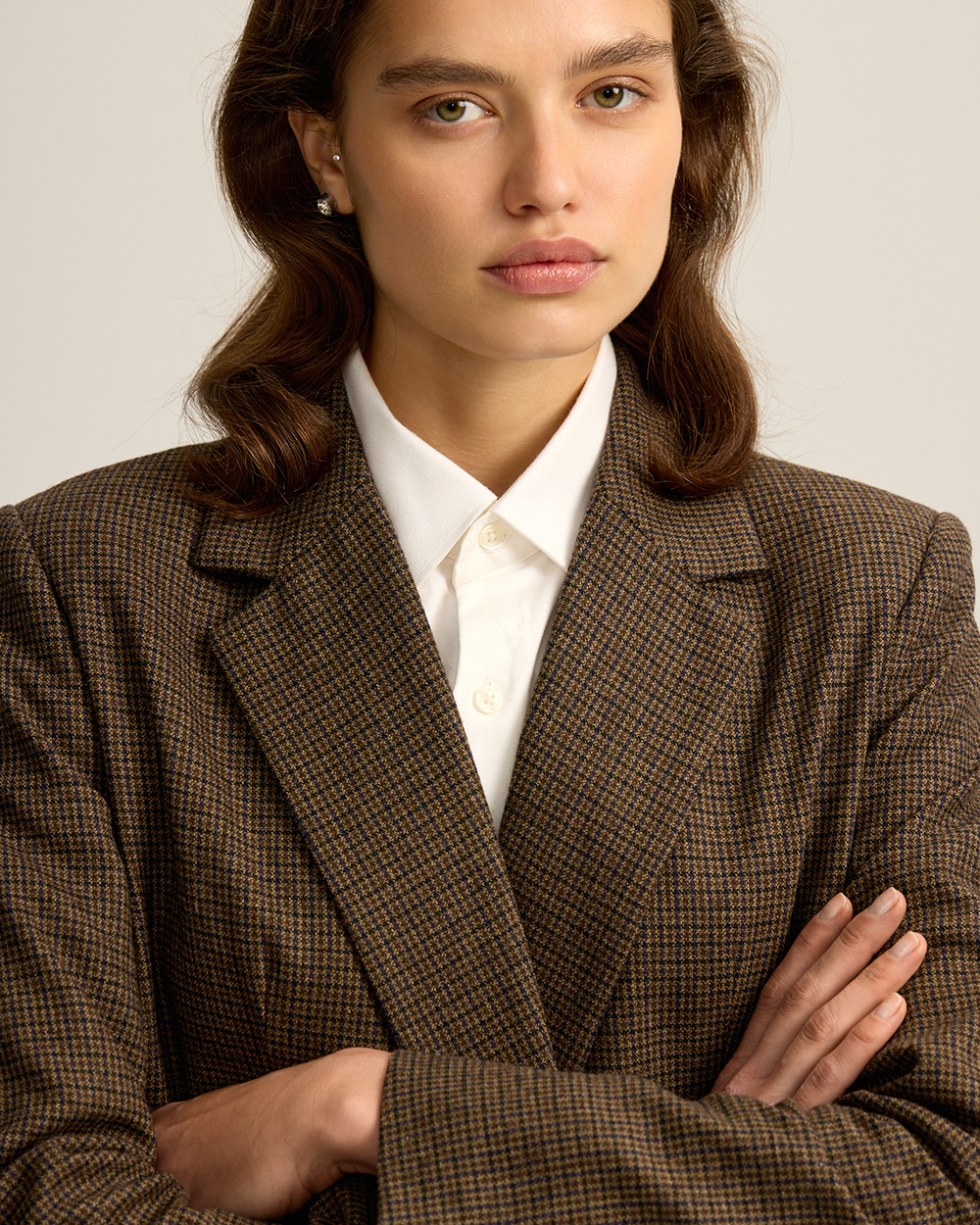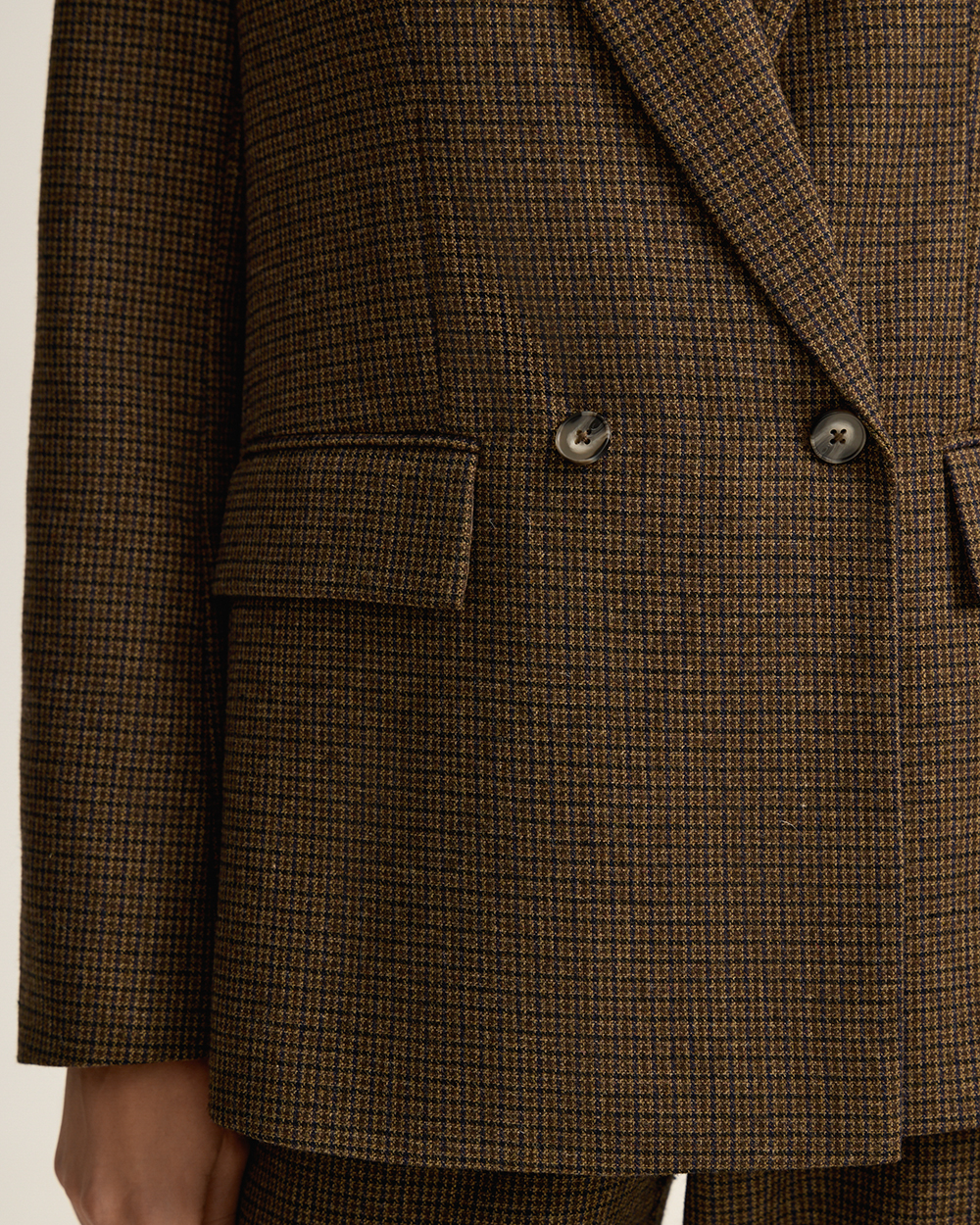 Жакет прямого кроя из костюмной ткани с шерстью — переосмысленная классика с намёком на традиционный твид “хаундстут”. Английские лацканы и карманы с клапанами. Комфортная подкладка из тенселя и вискозы.